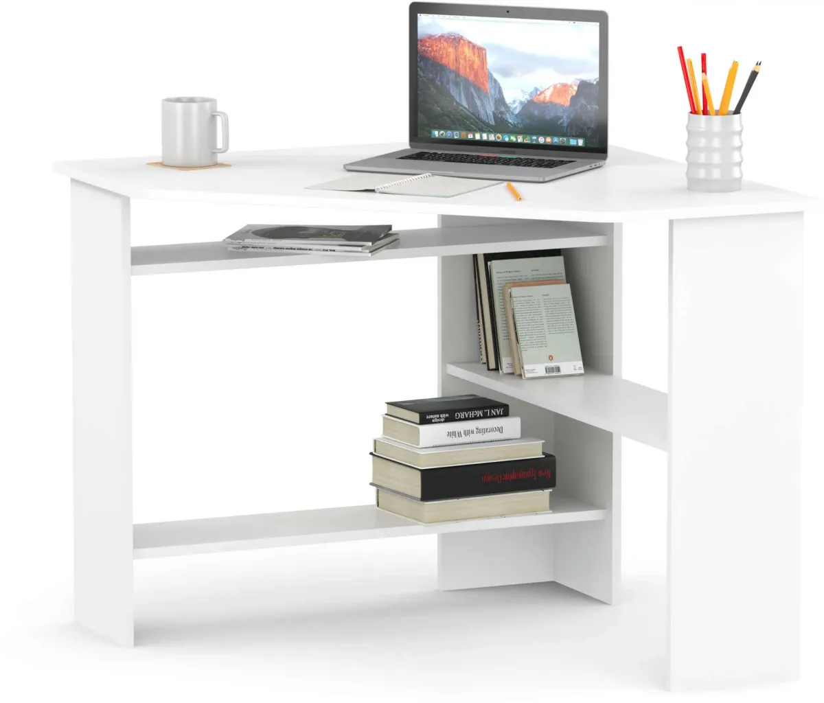 Функциональный вариант обустройства полноценной рабочей или учебной зоны. Просторная столешница разместит монитор или ноутбук, а также всё то, что необходимо держать под рукой для быстрого доступа. Несколько разноплановых полок станут удобной системой хра