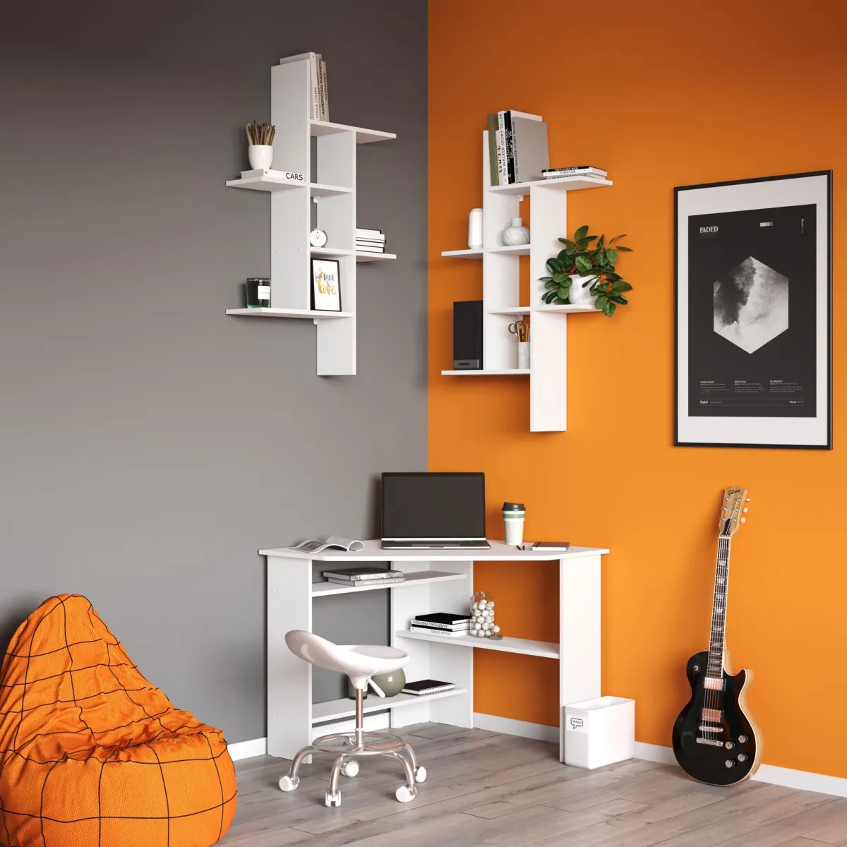 Функциональный вариант обустройства полноценной рабочей или учебной зоны. Просторная столешница разместит монитор или ноутбук, а также всё то, что необходимо держать под рукой для быстрого доступа. Несколько разноплановых полок станут удобной системой хра -