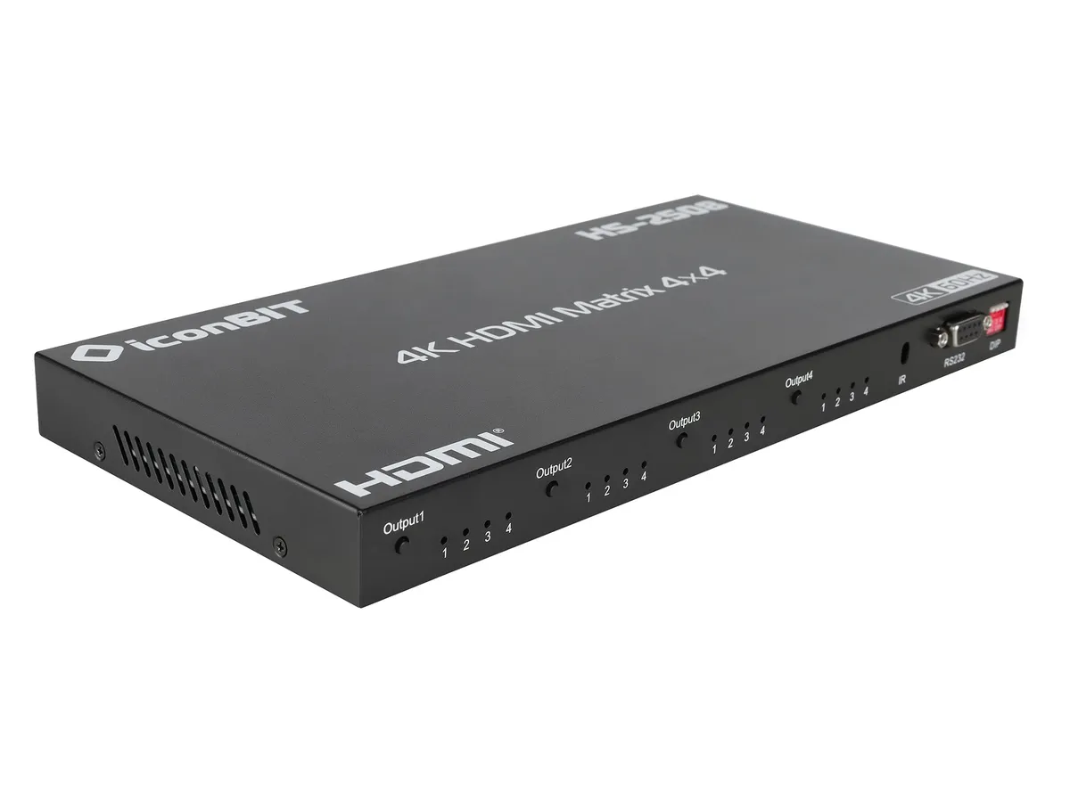 HDMI матричный коммутатор 4x4 позволяет подключать четыре источника сигнала HDMI к четырем дисплеям на одном экране. В то же время он может разделять или переключать четыре сигнала HDMI на четыре дисплея или проектора. Инфракрасный приемник и RS232 предоставляет дополнительную возможность управления. Матричный коммутатор HDMI 4x4 имеет возможность усиления сигнала HDMI для передачи по длинному кабелю без потери качества.