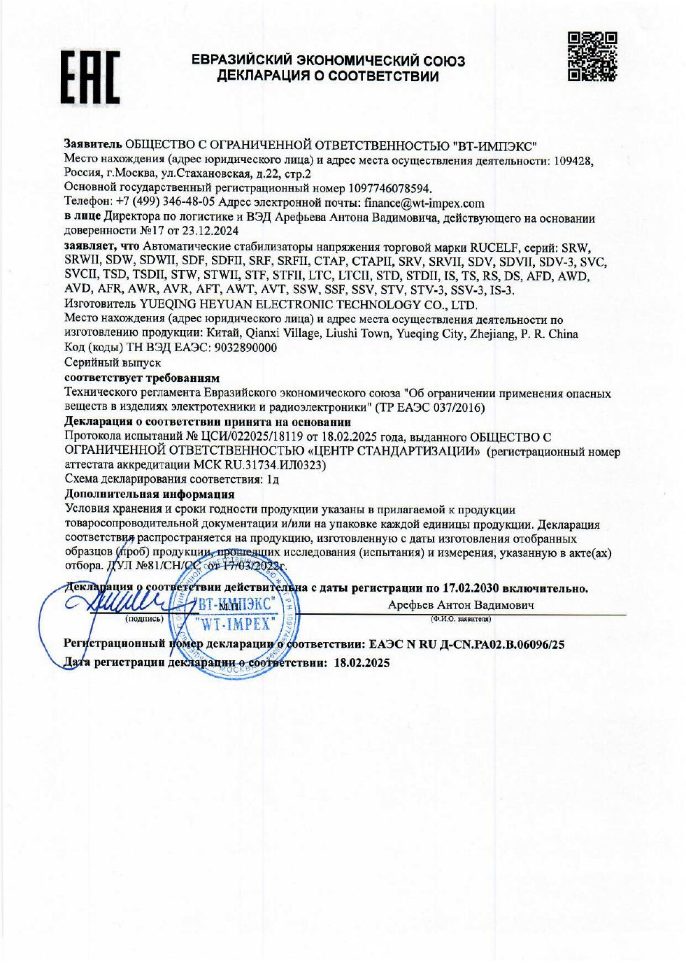 ЕАЭС N RU Д-CN.РА02.В.06096/25 | 17.02.2025 | 16.02.2030 |