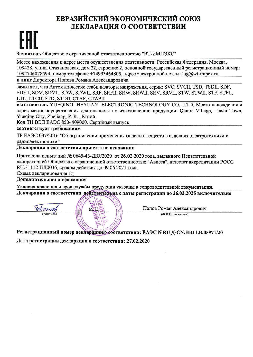 ЕАЭС N RU Д-CN.НВ11.В.05971/20 | 26.02.2020 | 25.02.2025 |