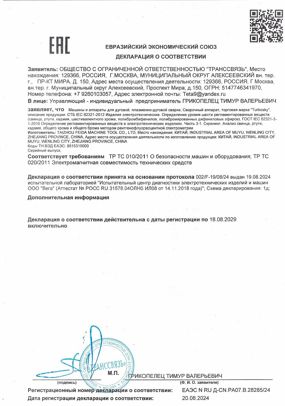 ЕАЭС N RU Д-CN.РА07.В.28285/24 | 19.08.2024 | 17.08.2029 |