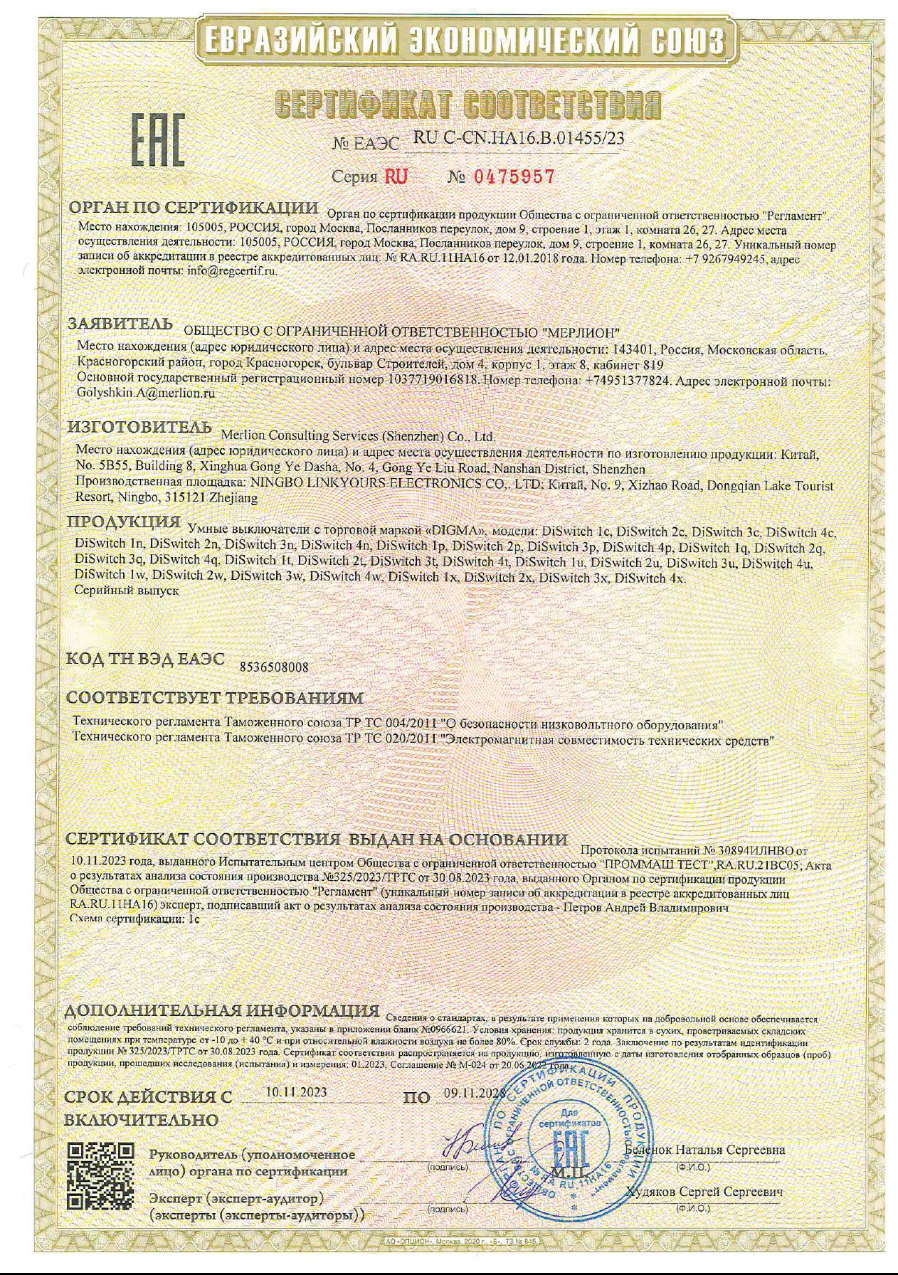 ЕАЭС RU С-CN.НА16.В.01455/23 | 09.11.2023 | 08.11.2028 |