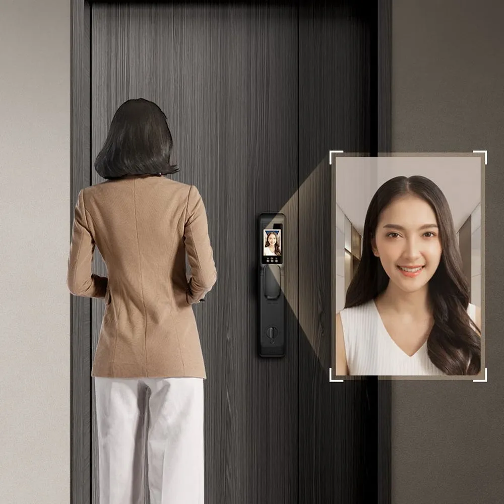 Встроенная камера 720P/89градусов. LCD IPS 3.5". Откр-е/закр-е - автоматическое. Ключ, брелок, сканер отпечатка пальца, Face ID или Bluetooth. Поддержка временных паролей. Время работы на одном заряде - до 6 месяцев. Внутр.панель - 422x83x77мм -