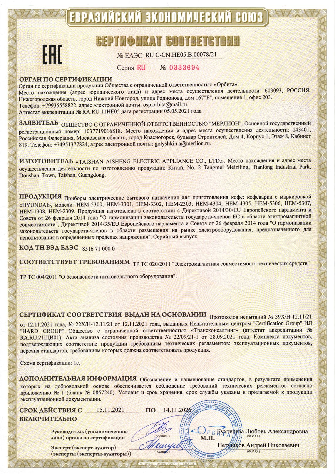 ЕАЭС RU С-CN.НЕ05.В.00078/21 | 14.11.2021 | 13.11.2026 |