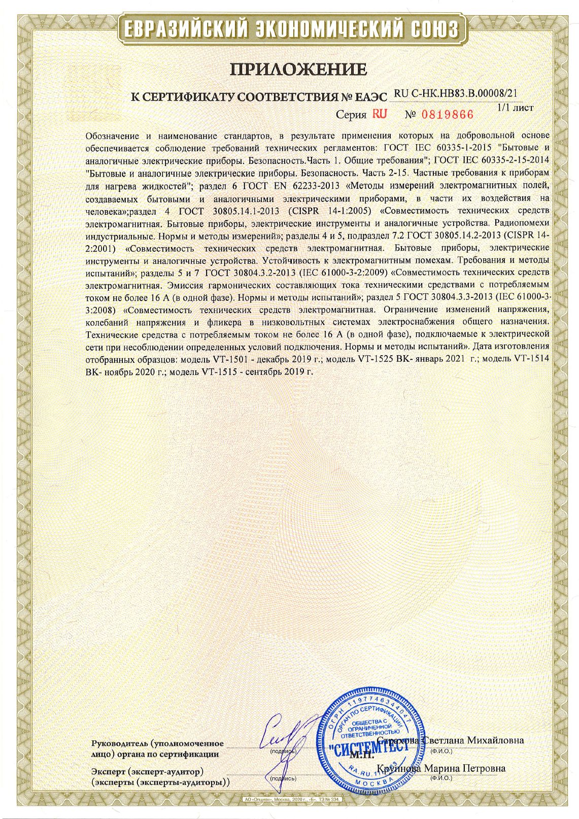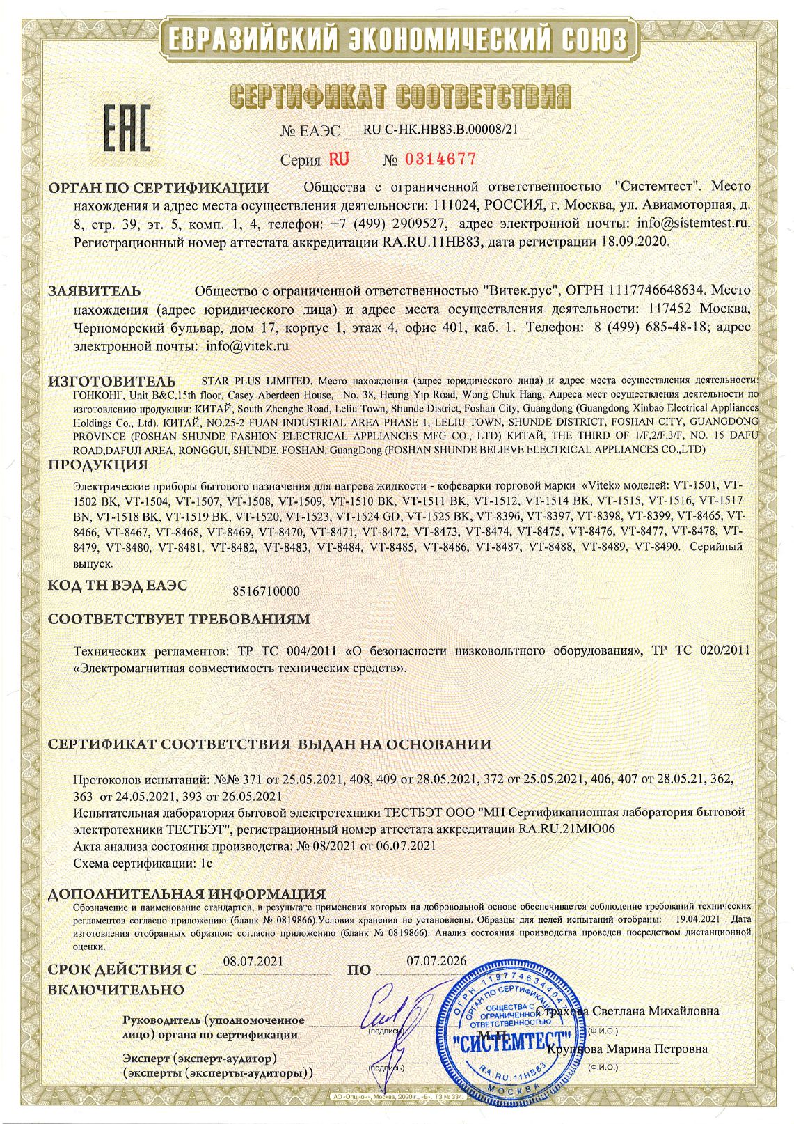 ЕАЭС RU С-HK.НВ83.В.00008/21 | 07.07.2021 | 06.07.2026 |