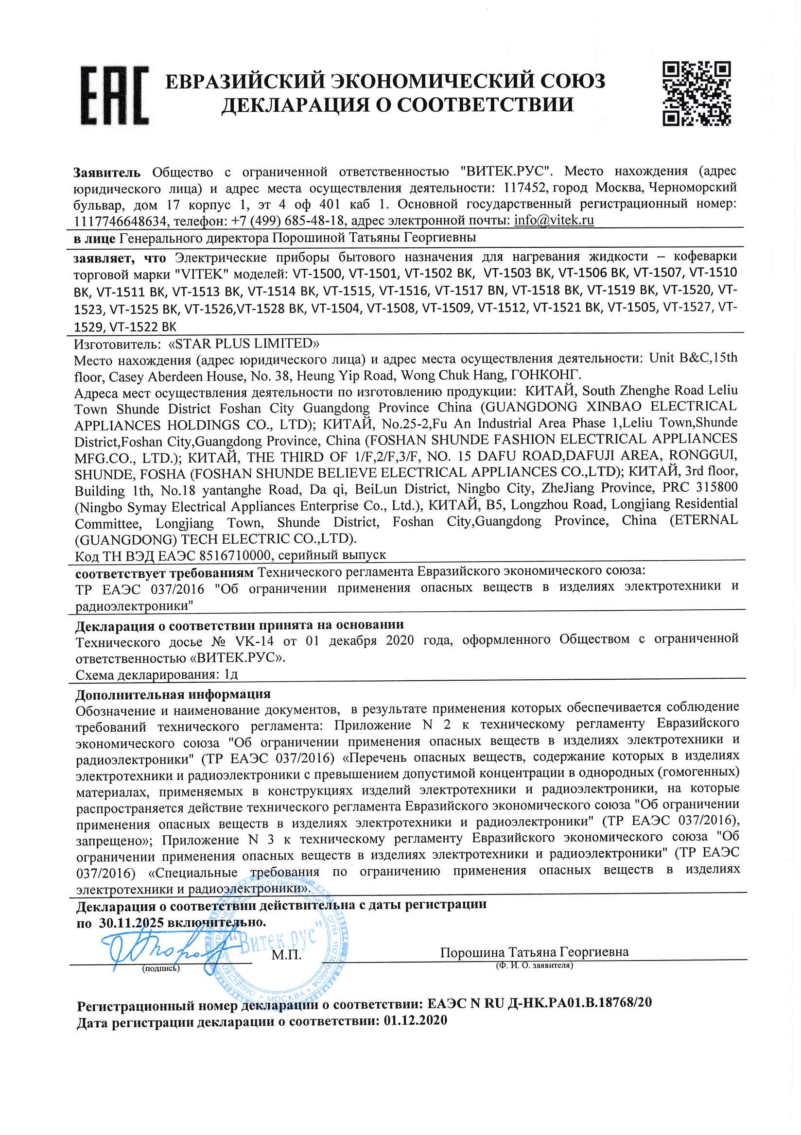 ЕАЭС N RU Д-HK.РА01.В.18768/20 | 30.11.2020 | 29.11.2025 |