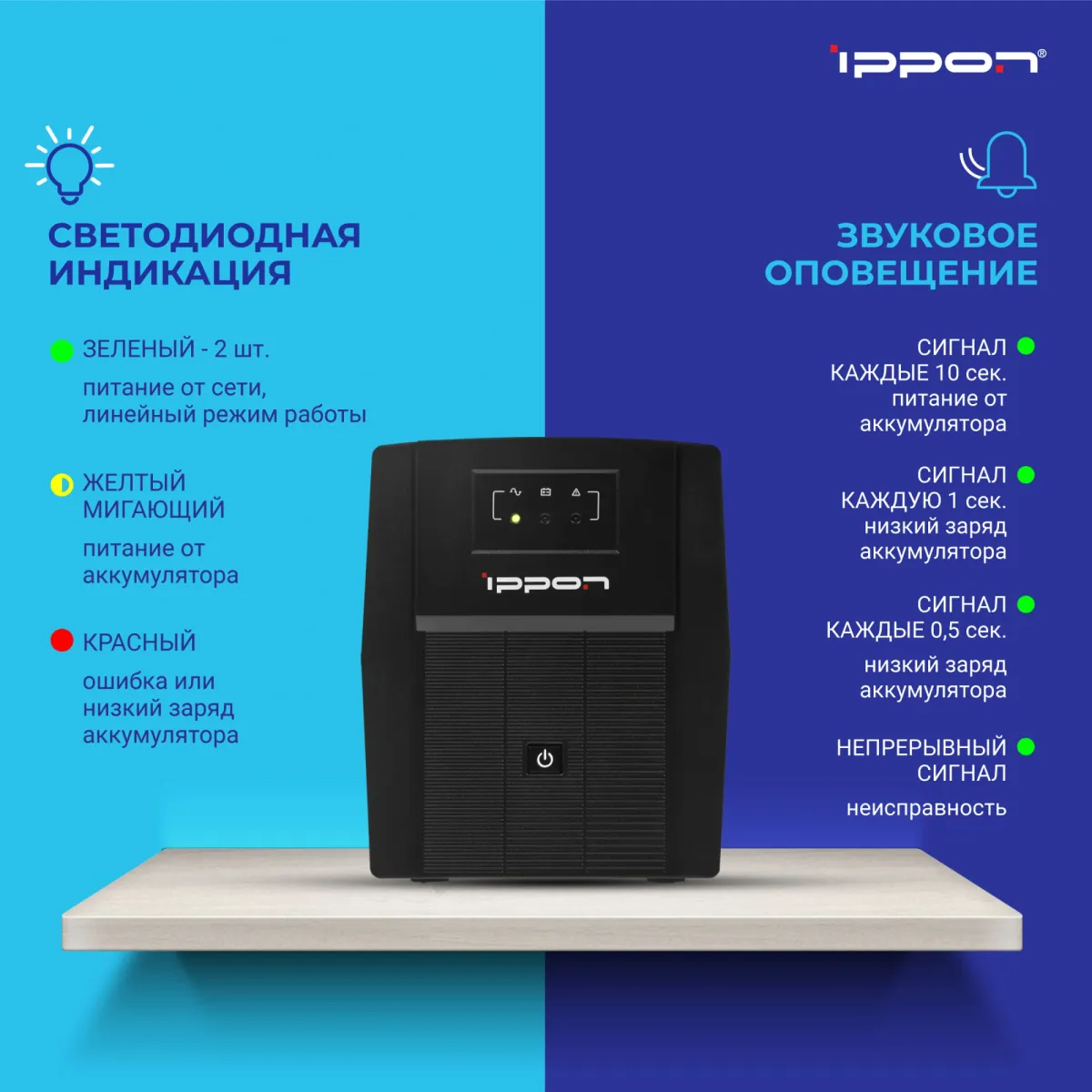Светодиодная: 2 шт зеленых – питание от сети, линейный режим; желтый мигающий – питание от аккумулятора; красный – ошибка/низкий заряд аккумулятора. Звуковая: сигнал каждые 10 сек – питание от аккумулятора; 1 сек – низкий заряд аккумулятора; 0,5 сек – пер -