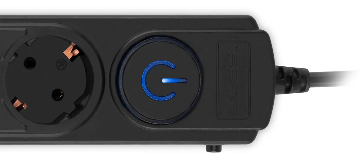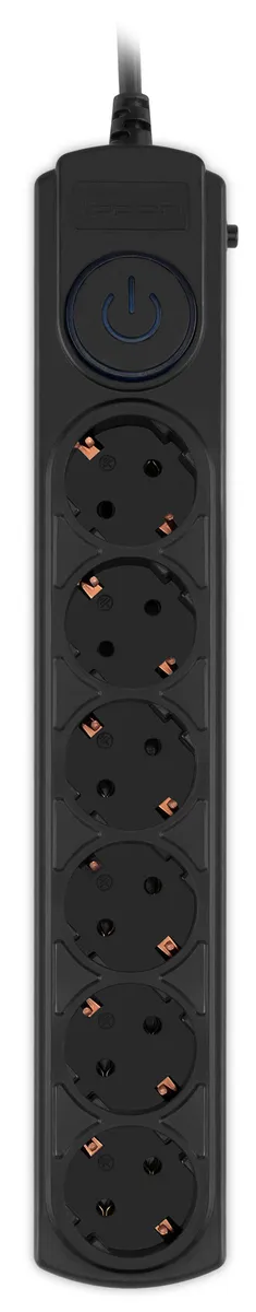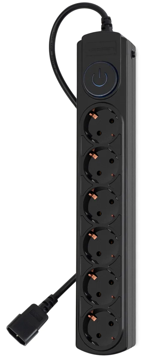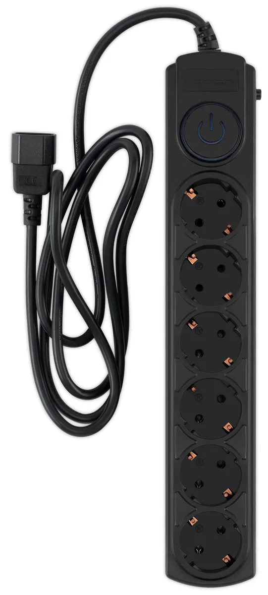 6 евророзеток с заземлением. Входная вилка IEC 320 (для подключения к ИБП). Защита от перегрузки. Защита от импульсов высокого напряжения. Защита от перетирания провода в месте входа в корпус фильтра. Ударопрочный негорючий корпус. Кнопка питания с индика -