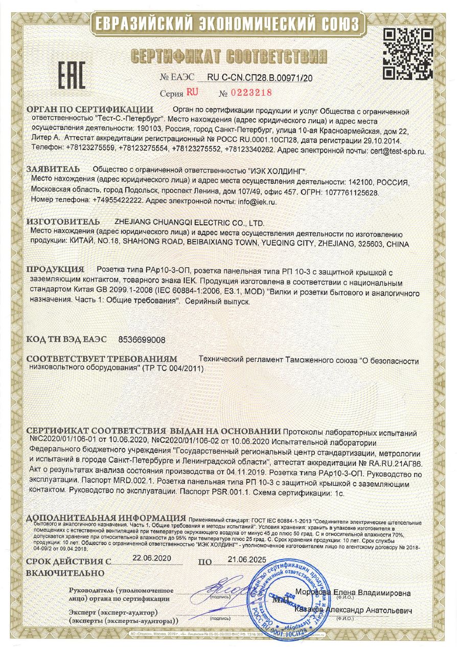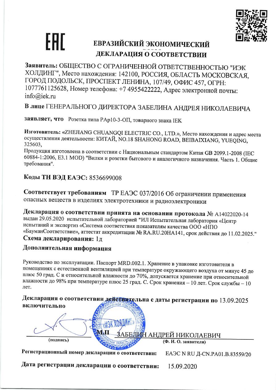 | Розетка силов. IEK РАр10-3-ОП MRD10-16 одинар. DIN - рейка зазем. IP20 белый | ЕАЭС N RU Д-CN.РА01.В.83559/20 | 14.09.2020 | 12.09.2025 |