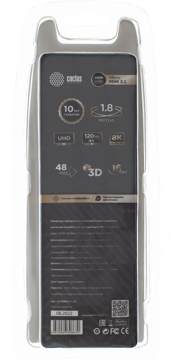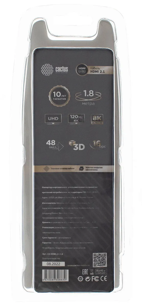 | Кабель аудио-видео Cactus CS-HDMI.2.1-1.8 HDMI (m)/HDMI (m) 1.8м. позолоч.конт. серебристый | ОТКАЗ_ТРТС RU ..ОТКАЗНОЕ | 10.01.2023 | 10.03.2026 |