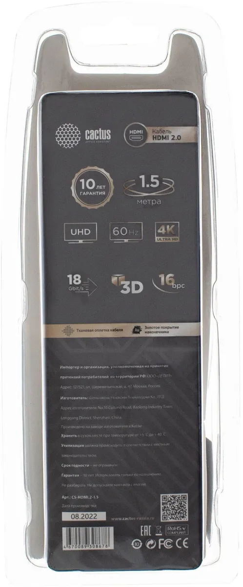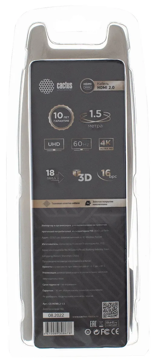 | Кабель аудио-видео Cactus CS-HDMI.2-1.5 HDMI (m)/HDMI (m) 1.5м. позолоч.конт. черный | ОТКАЗ_ТРТС RU ..ОТКАЗНОЕ | 10.01.2023 | 10.03.2026 |