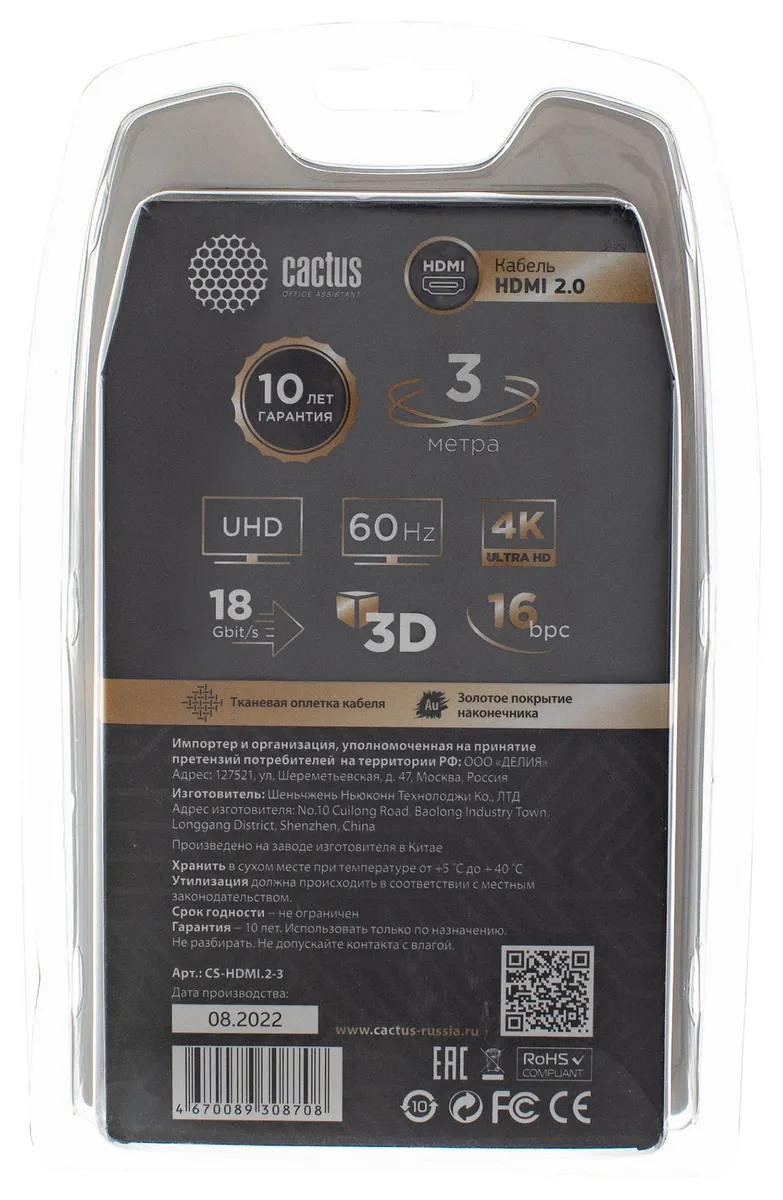 | Кабель аудио-видео Cactus CS-HDMI.2-3 HDMI (m)/HDMI (m) 3м. позолоч.конт. черный | ОТКАЗ_ТРТС RU ..ОТКАЗНОЕ | 10.01.2023 | 10.03.2026 |
