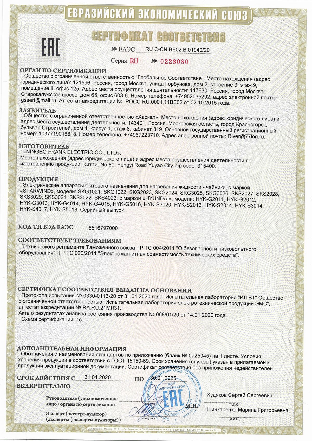 | Чайник электрический Hyundai HYK-G2011 1.7л. 2200Вт черный корпус: стекло/пластик | ЕАЭС RU CN .ВЕ02.В01940/20 | 30.01.2020 | 29.01.2025 |