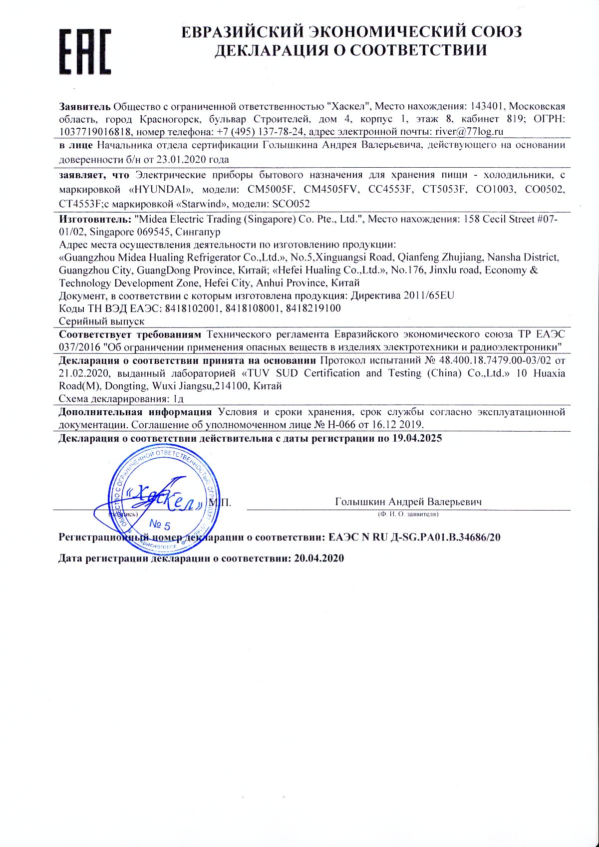| Холодильник Hyundai CO1003 1-нокамерн. белый | ЕАЭС N RU Д-SG.РА01.В.34686/20 | 19.04.2020 | 18.04.2025 |