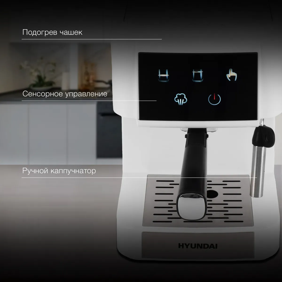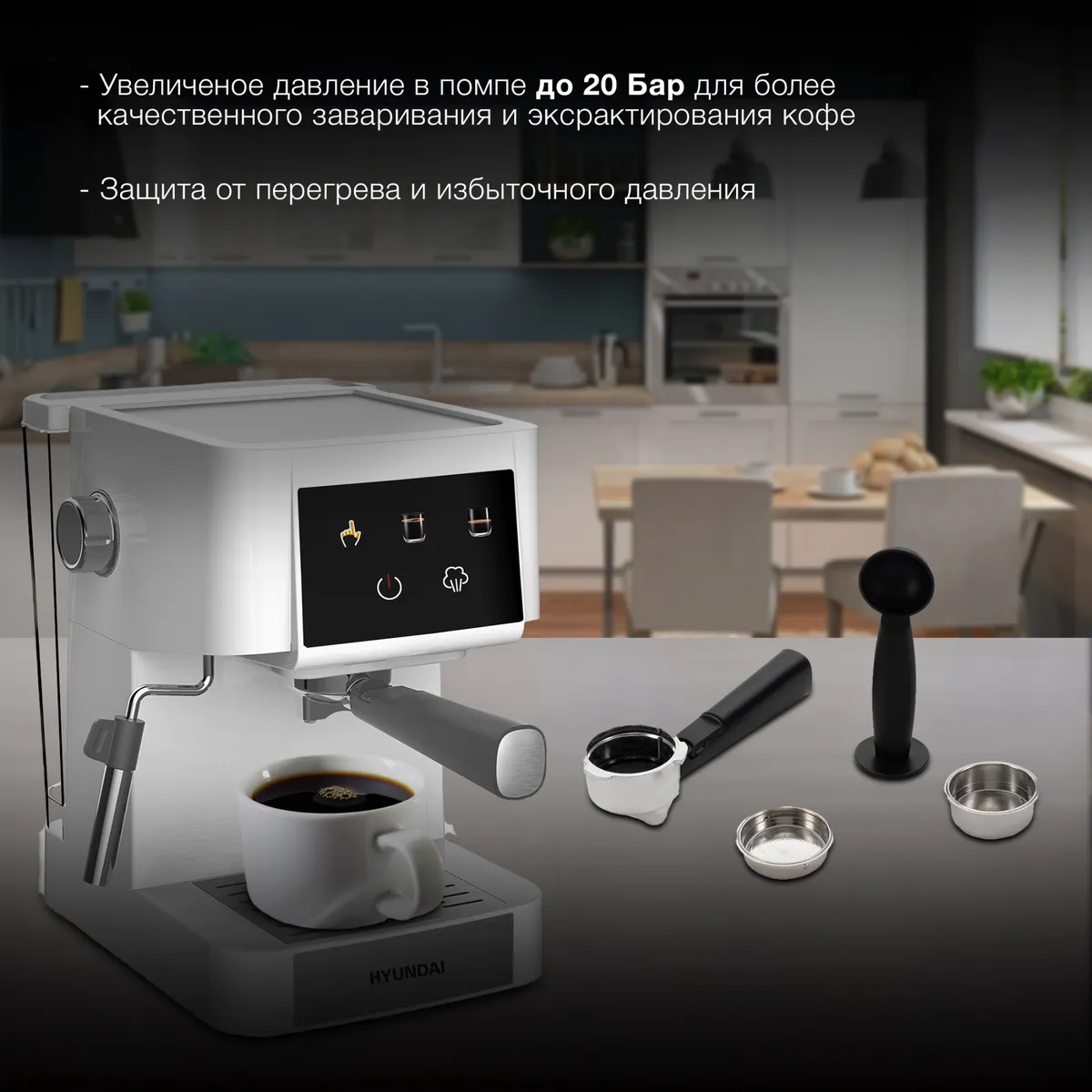 Помпа 20 бар для качественного экстрактирования, сенсорный дисплей, цветные эконки, ручная программа для дозирования объема порции, ручной каппучинатор для взбивания молока, площадка подогрева чашек и съемный поддон для капель, фильтр-сито на 1 и 2 порци -