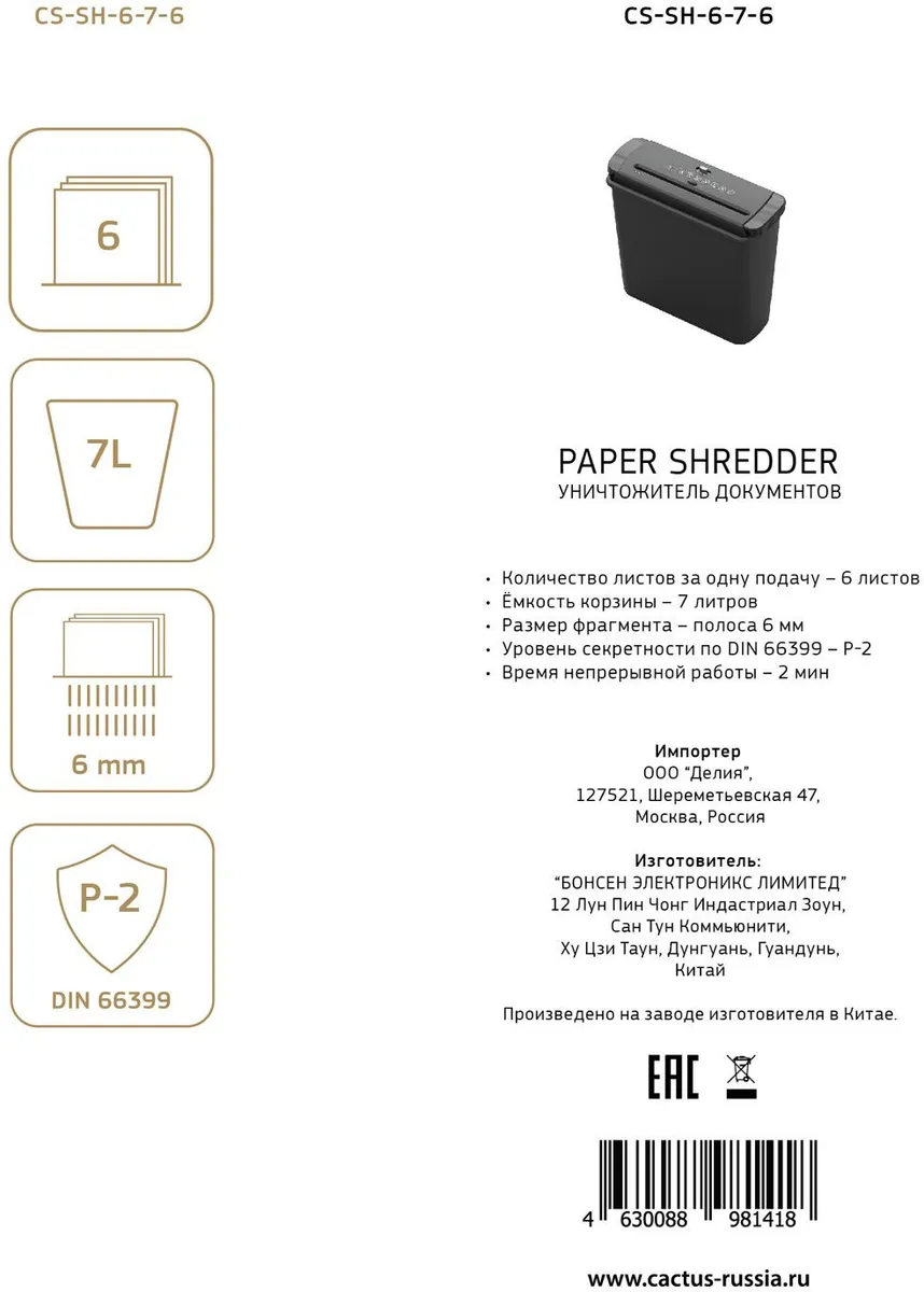 Шредер Cactus CS-SH-6-7-6 (секр.Р-2) ленты 6лист. 7лтр. | ЕАЭС N RU Д-CN.ВЕ02.В.13132/20 | 06.12.2020 | 05.12.2025 |