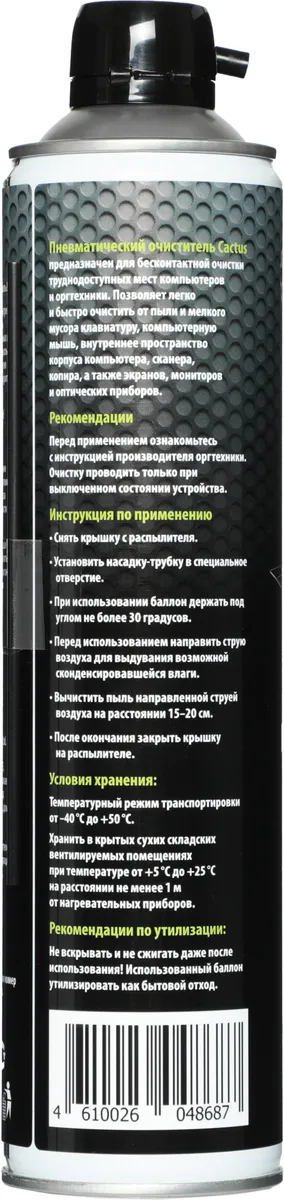 Эффективное средство для бесконтактной очистки труднодоступных мест компьютера и другой оргтехники. Удаление пыли с его помощью позволяет снизить вероятность перегрева деталей компьютера или ноутбука, а также уберет внезапно появившийся гул из корпуса. В -