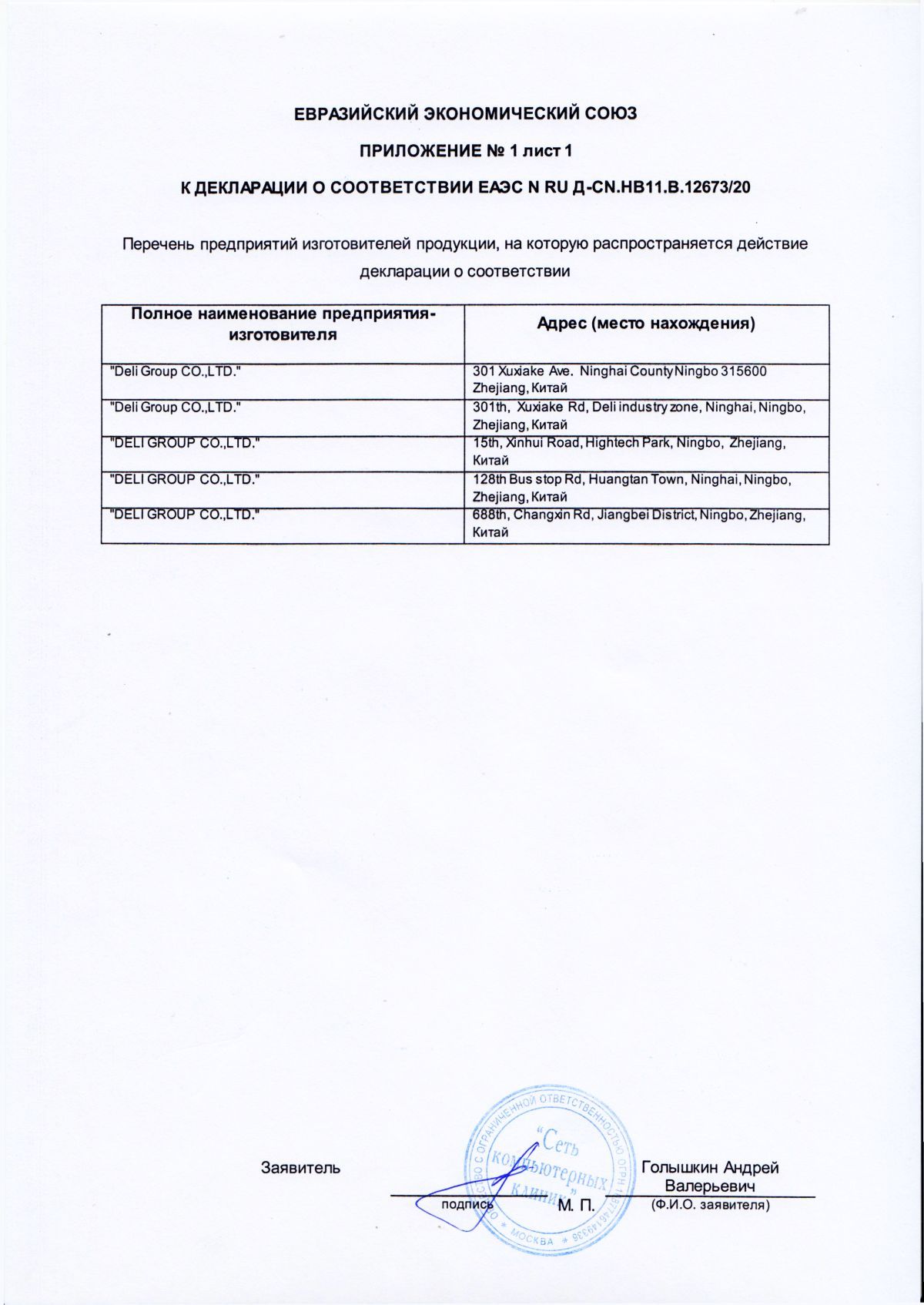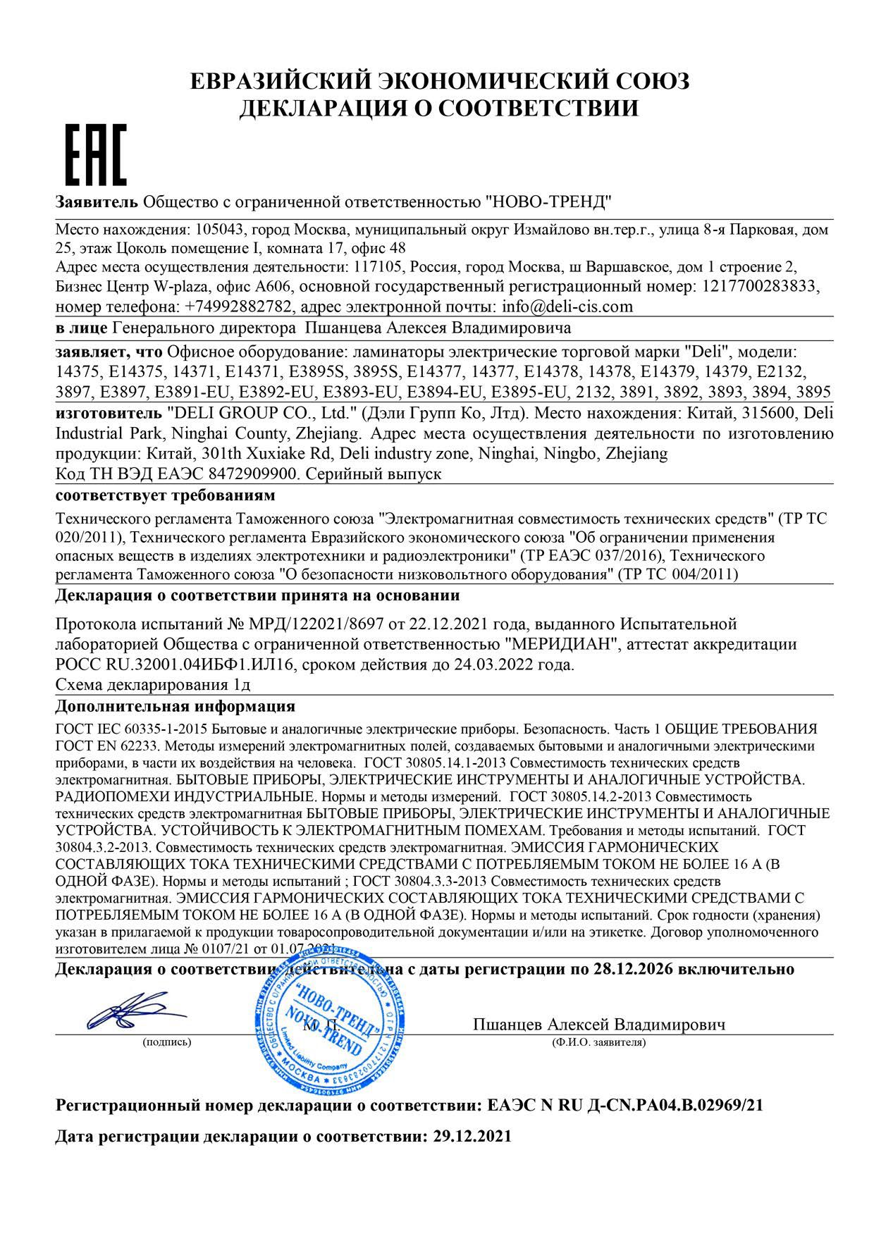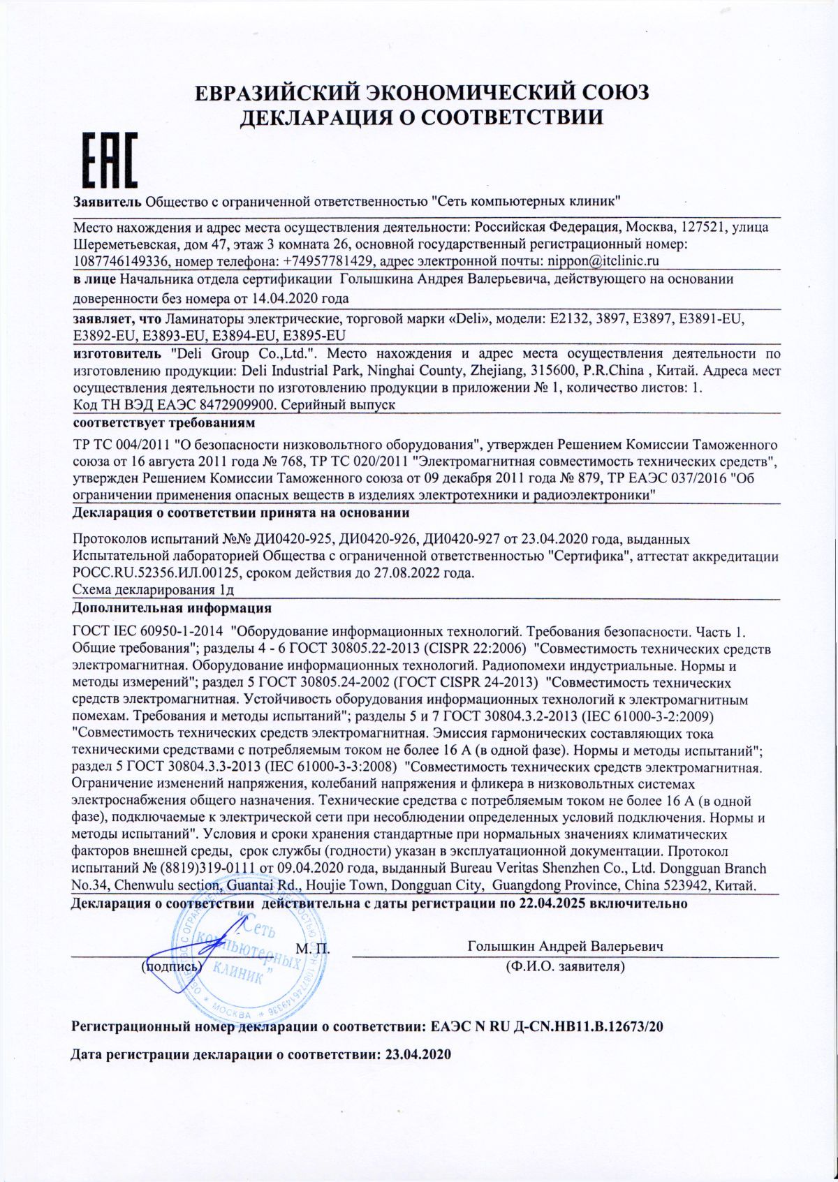 Ламинатор Deli E3891-EU A4 (80-200мкм) 25см/мин хол.лам. лам.фото реверс | ЕАЭСД RU CN Д.НВ11.В.12673/20 | 22.04.2020 | 21.04.2025 |