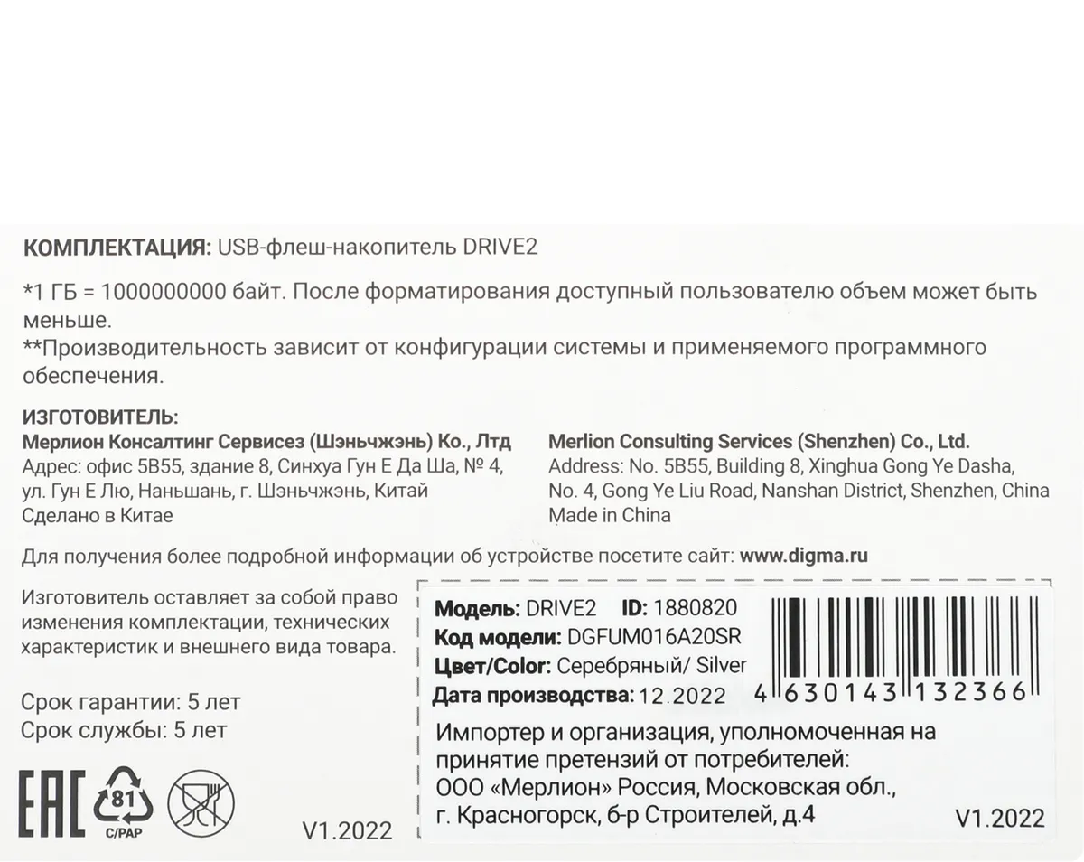 | Флеш Диск Digma 16Gb DRIVE2 DGFUM016A20SR USB2.0 серебристый | ЕАЭС N RU Д-CN.РА09.В.25228/24 | 08.10.2024 | 07.10.2029 |