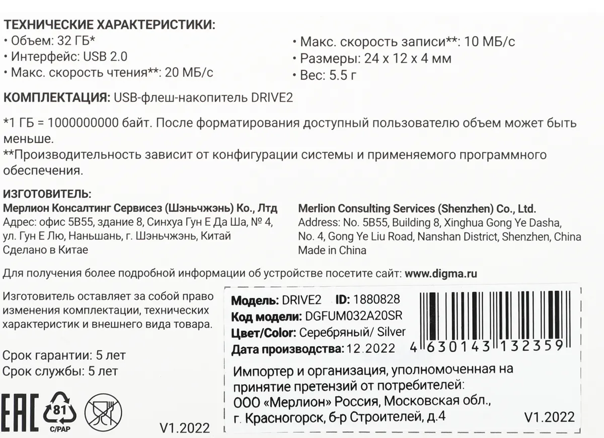 | Флеш Диск Digma 32Gb DRIVE2 DGFUM032A20SR USB2.0 серебристый | ЕАЭС N RU Д-CN.РА09.В.25228/24 | 08.10.2024 | 07.10.2029 |