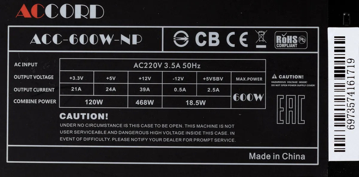 Блок питания Accord ATX 600W ACC-600W-NP (20+4pin) 120mm fan 4xSATA (ACC-600-NP)