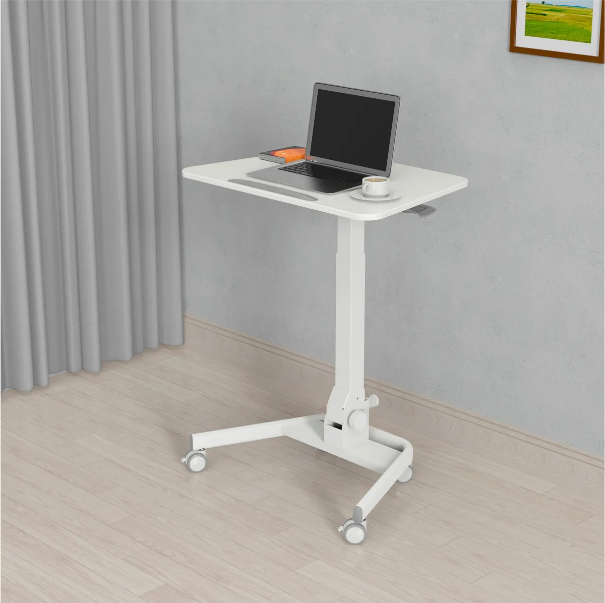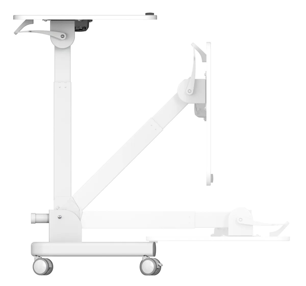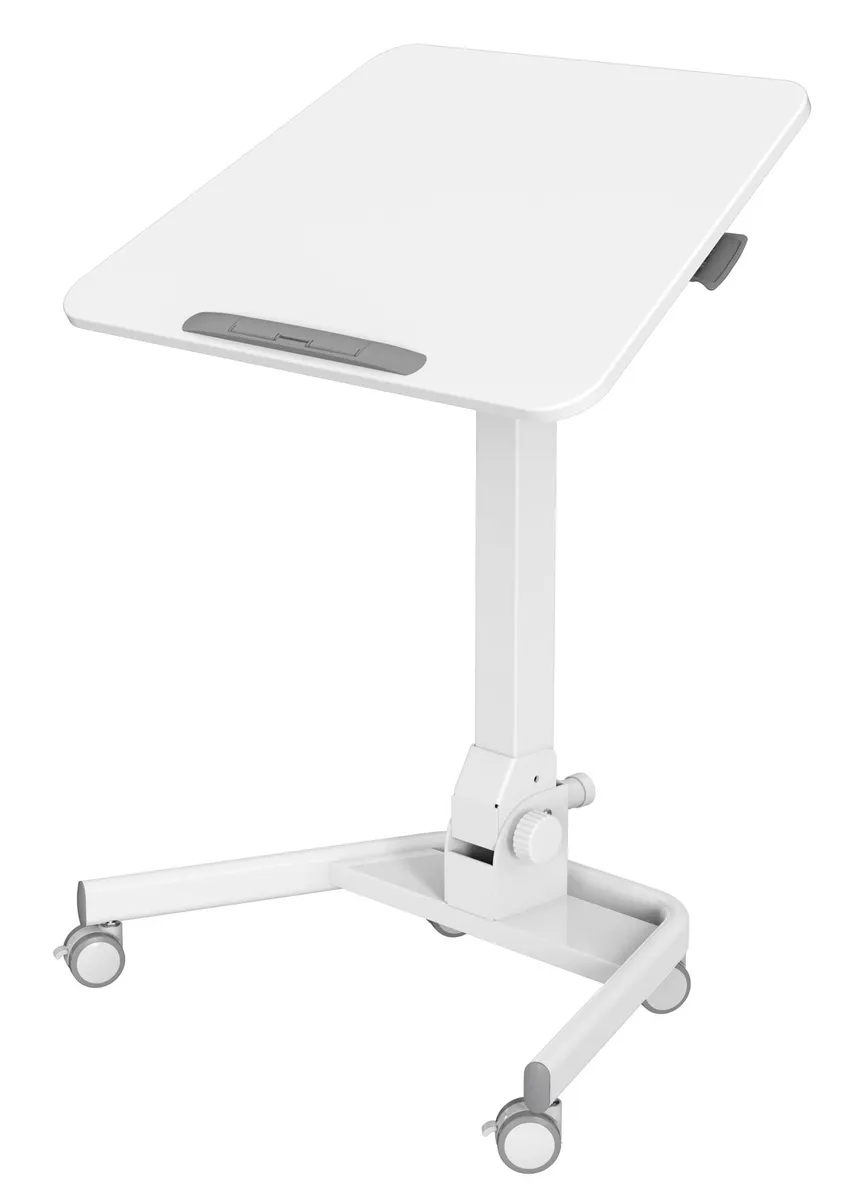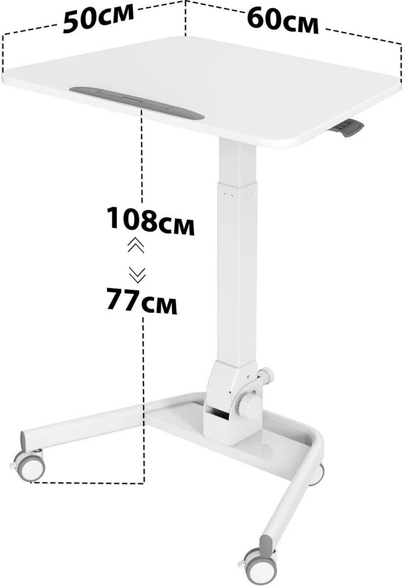 Простое управление: подъемный механизм плавно опускает и поднимает столешницу, можно остановить в любом положении. Наличие 4 колес обеспечивает маневренность, 2 колеса со стопором, для придания устойчивости. Полностью складной стол, удобное хранение и тра -
