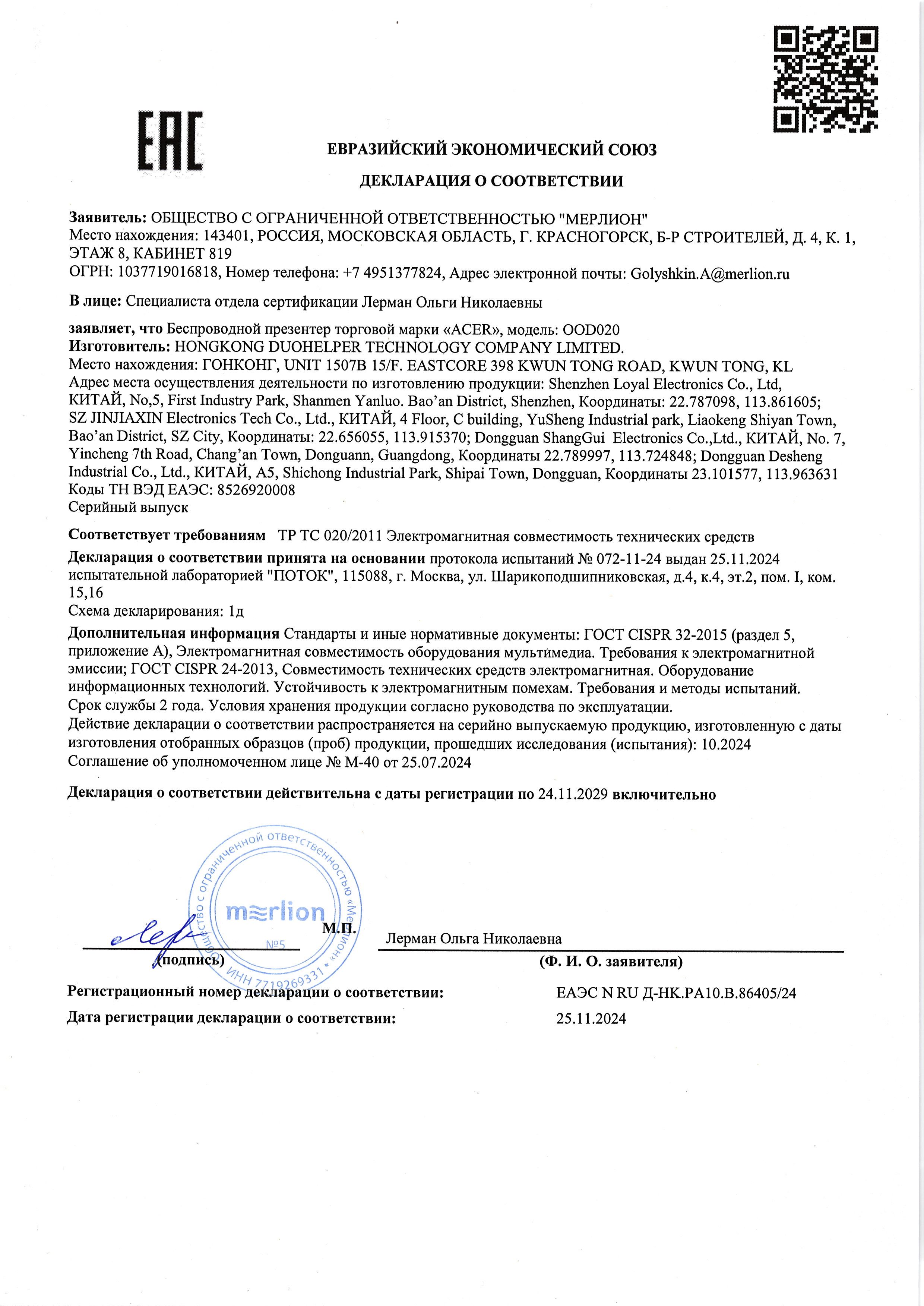 | Презентер Acer OOD020 Radio USB (30м) черный | ЕАЭС N RU Д-HK.РА10.В.86405/24 | 24.11.2024 | 23.11.2029 |