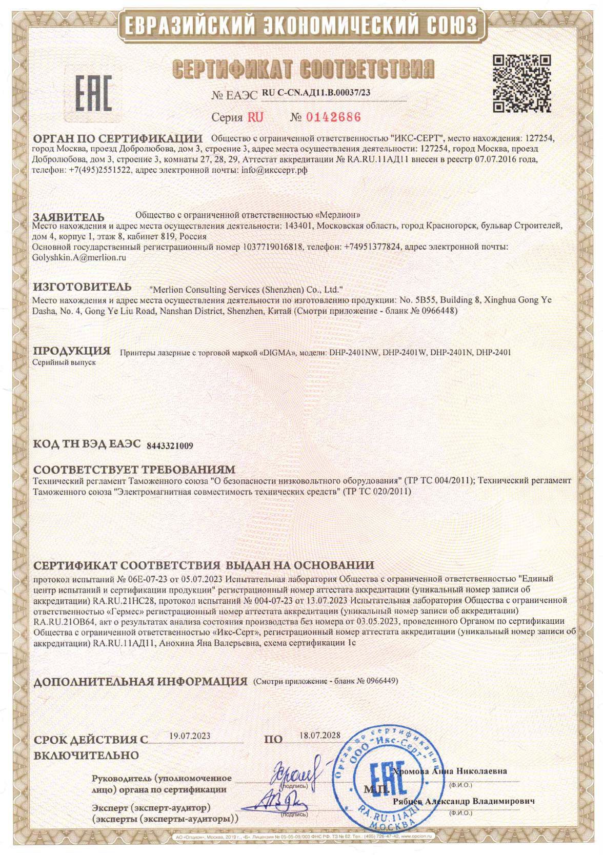 | Принтер лазерный Digma DHP-2401 A4 серый | ЕАЭС RU С-CN.АД11.В.00037/23 | 18.07.2023 | 17.07.2028 |