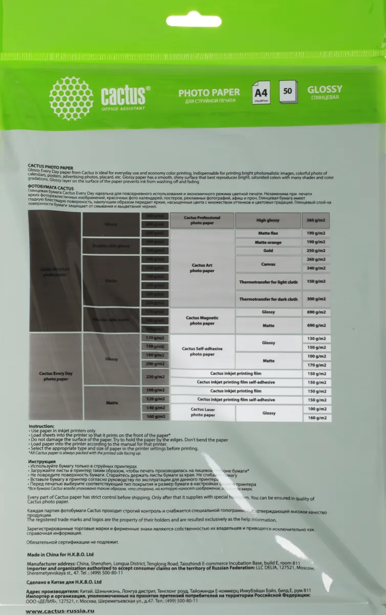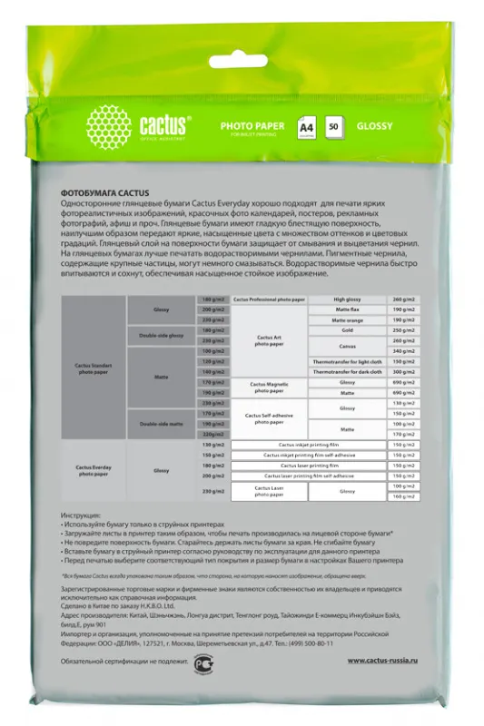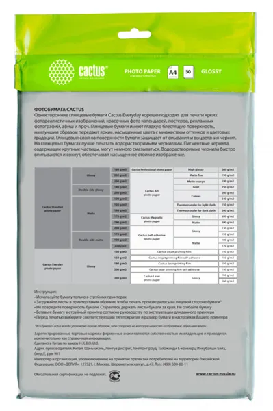 Фотобумага Cactus CS-GA415050ED A4/150г/м2/50л./белый глянцевое для струйной печати (CS-GA415050ED)