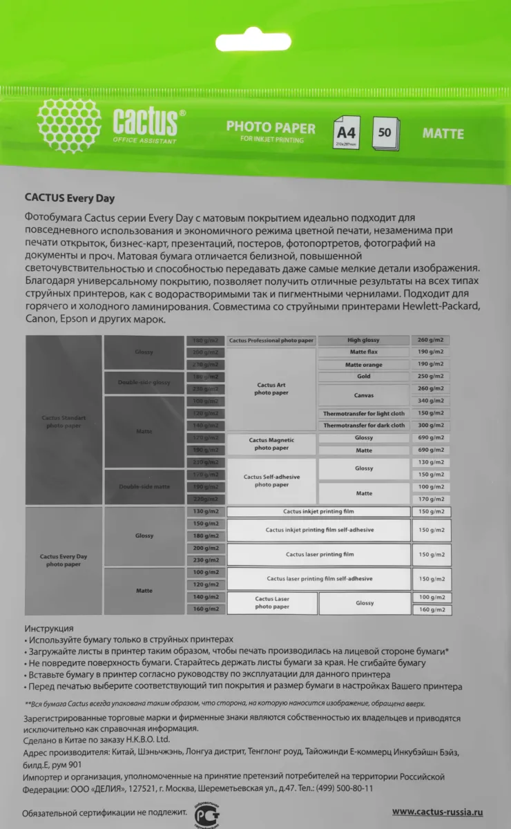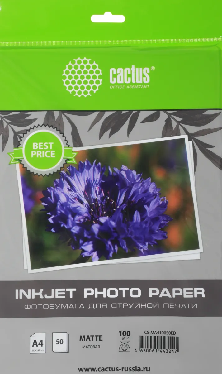 Фотобумага Cactus CS-MA410050ED A4/100г/м2/50л./белый матовое для струйной печати (CS-MA410050ED)