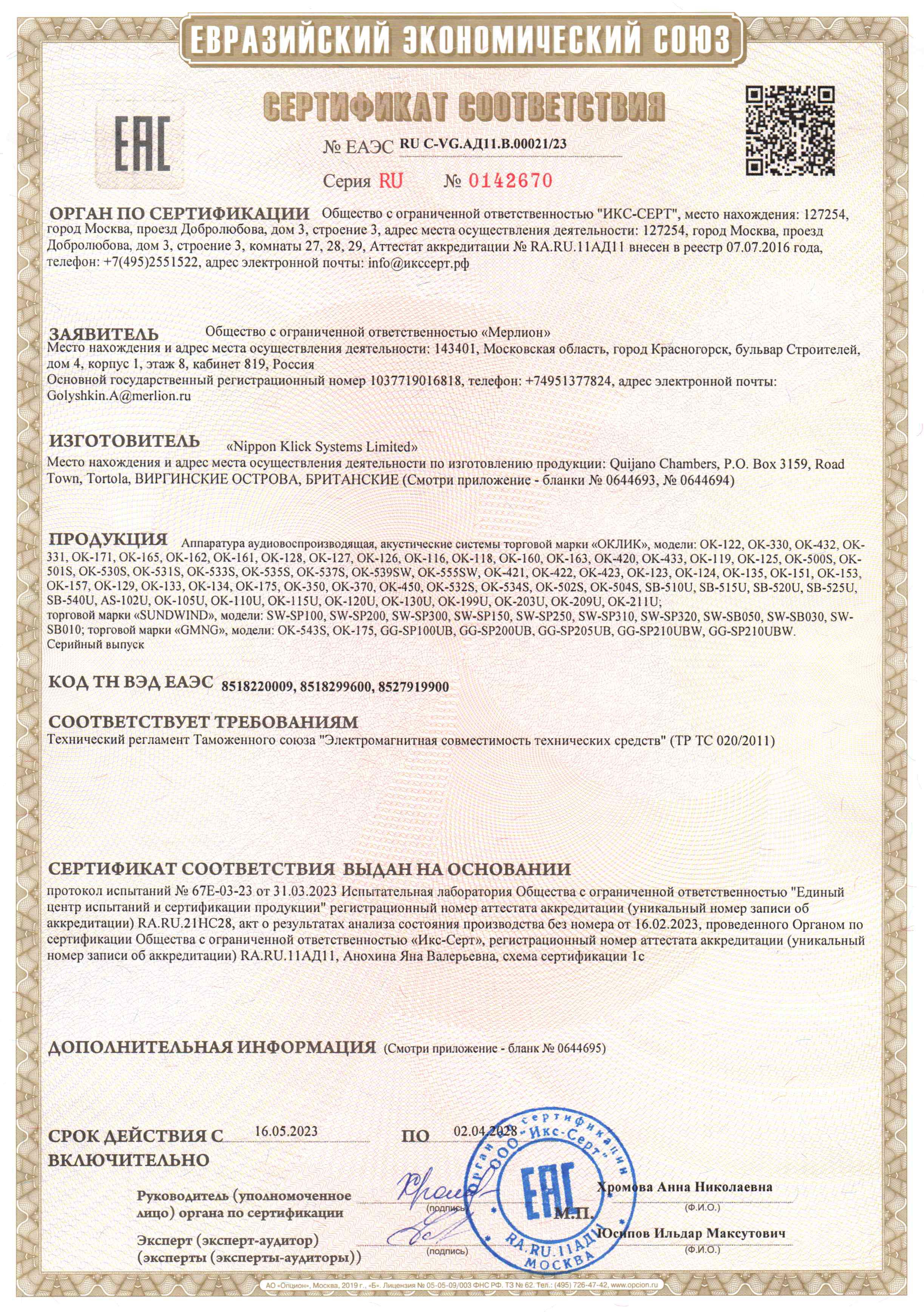 ЕАЭС RU С-VG.АД11.В.00021/23 | 15.05.2023 | 01.04.2028 |