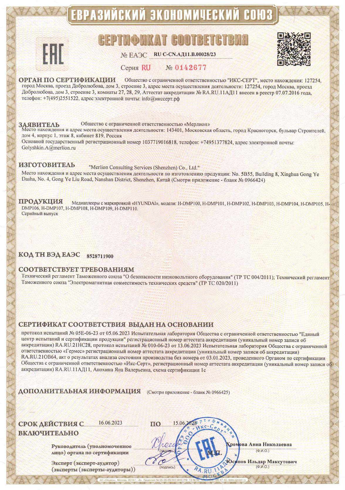 | Медиаплеер Hyundai H-DMP103 64Gb | ЕАЭС RU С-CN.АД11.В.00028/23 | 15.06.2023 | 14.06.2028 |