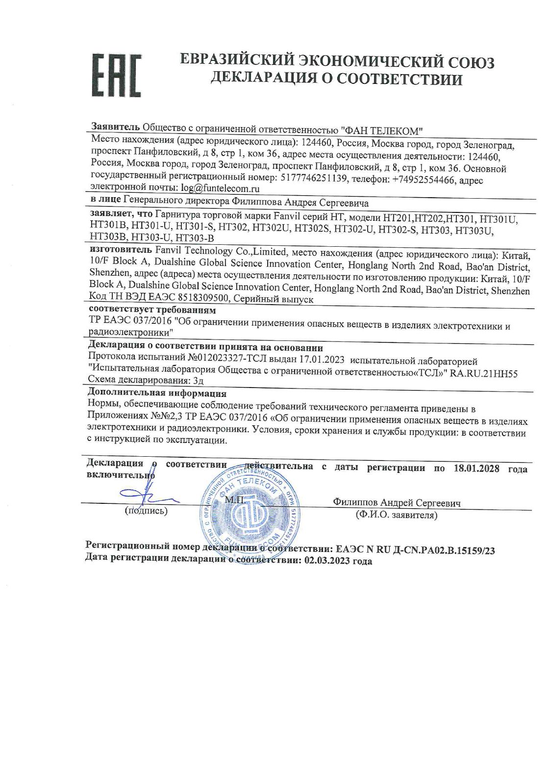 | Гарнитура проводная Fanvil HT302 черный | ЕАЭС N RU Д-CN.РА02.В.15159/23 | 01.03.2023 | 17.01.2028 |