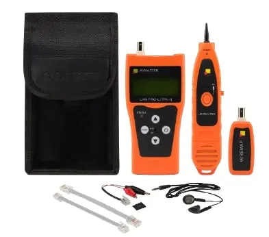 Главный блок, индуктивный щуп, ответная часть, батарея 6F22 9V — 2 шт., кабель RJ45, кабель RJ11, Кабель RJ11 - крокодилы, наушники, сумка-чехол на ремне, инструкция по эксплуатации. -
