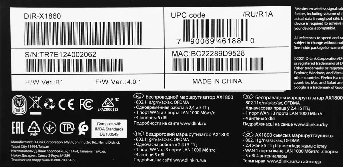 Маршрутизатор DIR-X1860, Адаптер питания постоянного тока 12В/1А, Ethernet-кабель, Документ «Краткое руководство по установке» (буклет). -