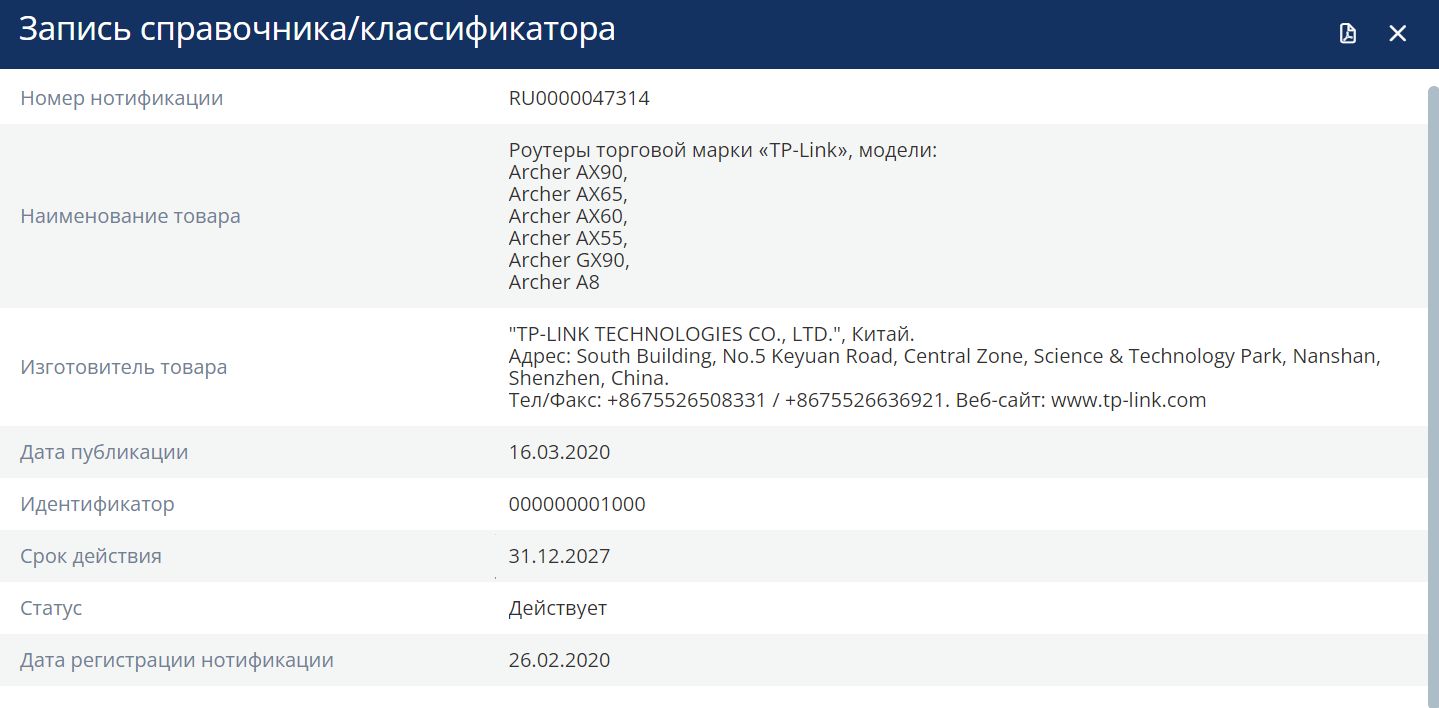 | Роутер модели: Archer AX11000, Archer AX6000, Archer GX90, Archer AX90, Archer AX73, Archer AX68, Ar... | Нотификация ФСБ | 03.12.2020 | 30.12.2027 |
