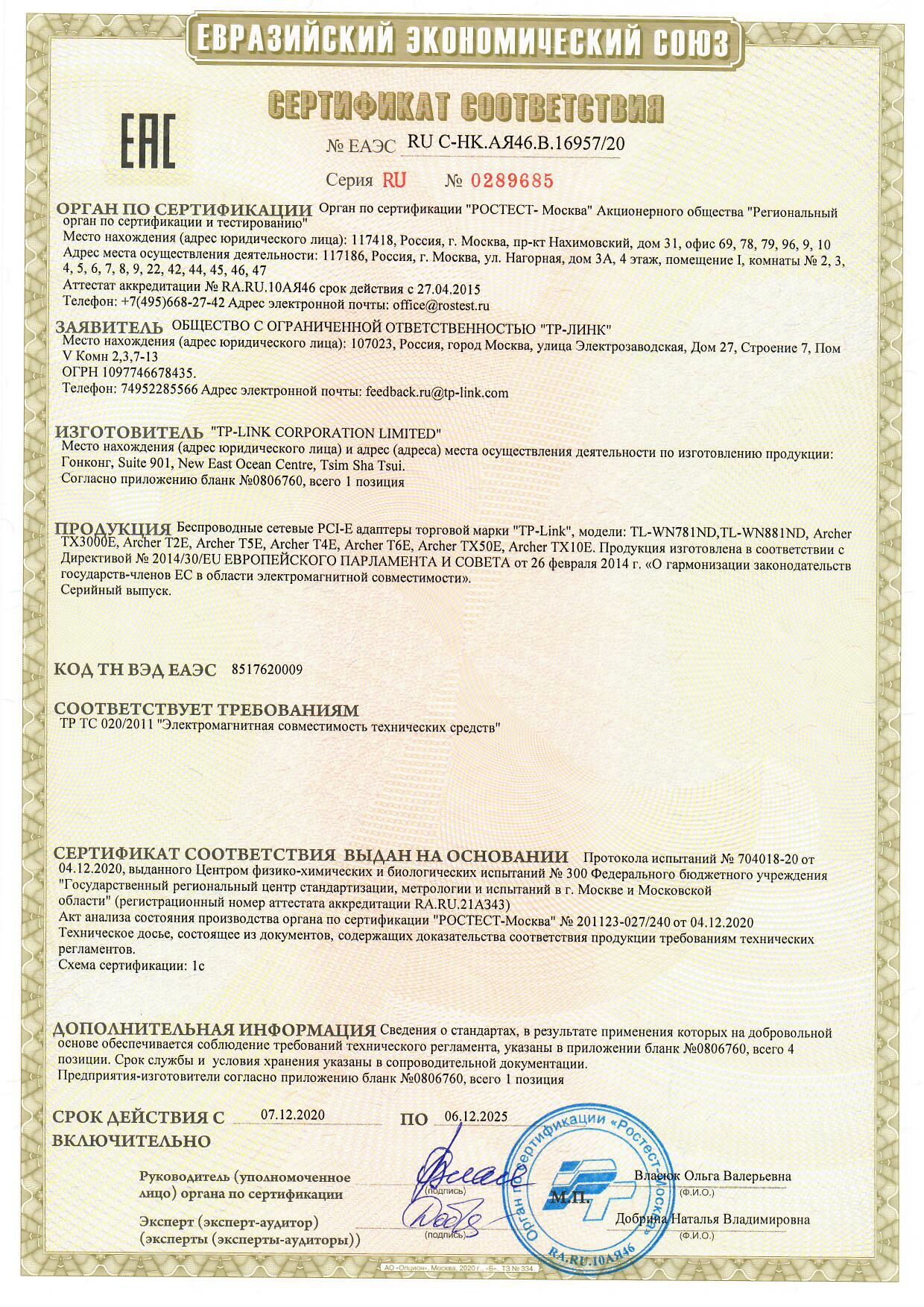 | Беспроводные сетевые PCI-E адаптеры торговой марки "TP-Link", модели: TL-WN781ND, TL-WN881ND, Archer... | Сертификат соответствия | 10.10.2022 | 09.10.2027 |