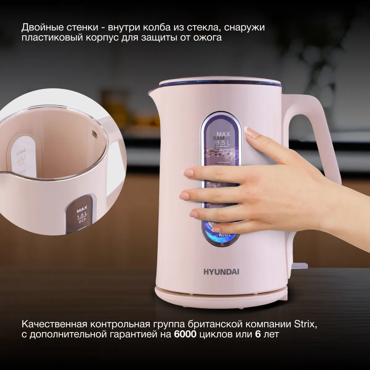 Двойной теплоизолированный корпус. Внешний корпус из термостойкого пластика, защищает от случайного ожога при прикосновении. Внутренний корпус из боросиликатного стекла, не впитывает и не выделяет примесей, не темнеет и не окрашивается со временем. -
