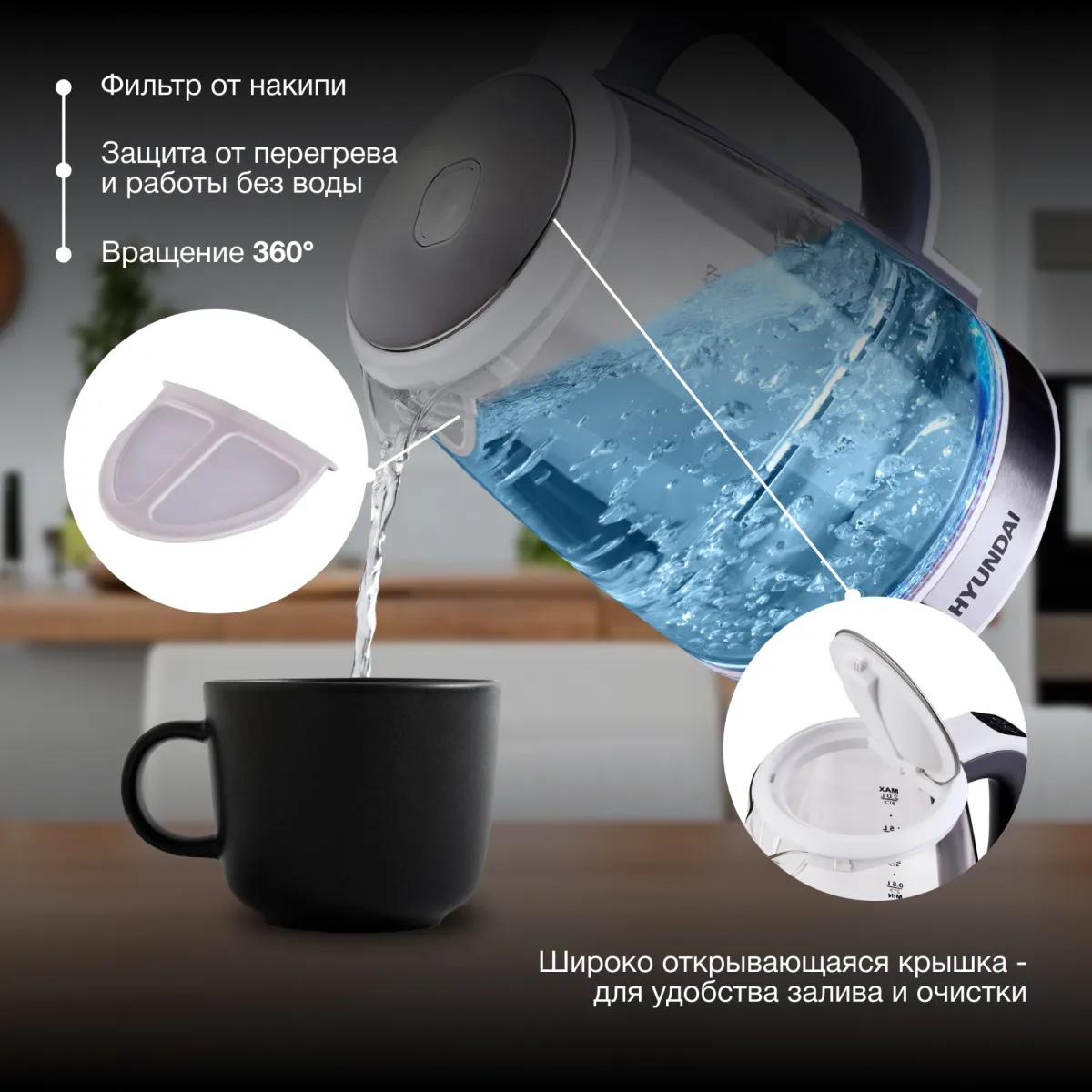 кнопка открытия крышки, подсветка воды, подставка 360, фильтр от накипи -