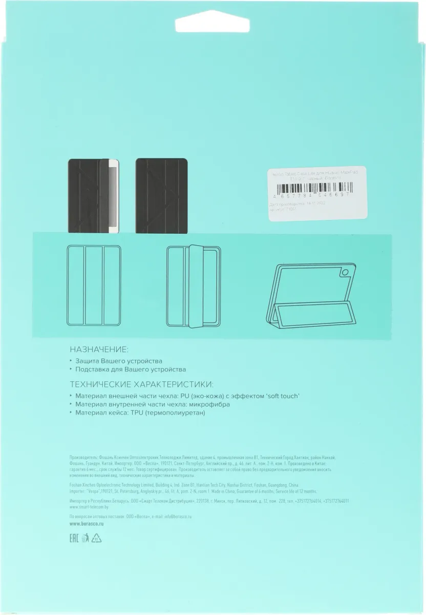 Чехол-подставка BoraSco разработан для Huawei MatePad T10 9,7" с учётом всех технологических отверстий. Материал внешней части чехла: эко-кожа, задняя часть: прозрачный силикон. Есть функция подставки, для лучшей фиксации предусмотрены встроенные магниты -