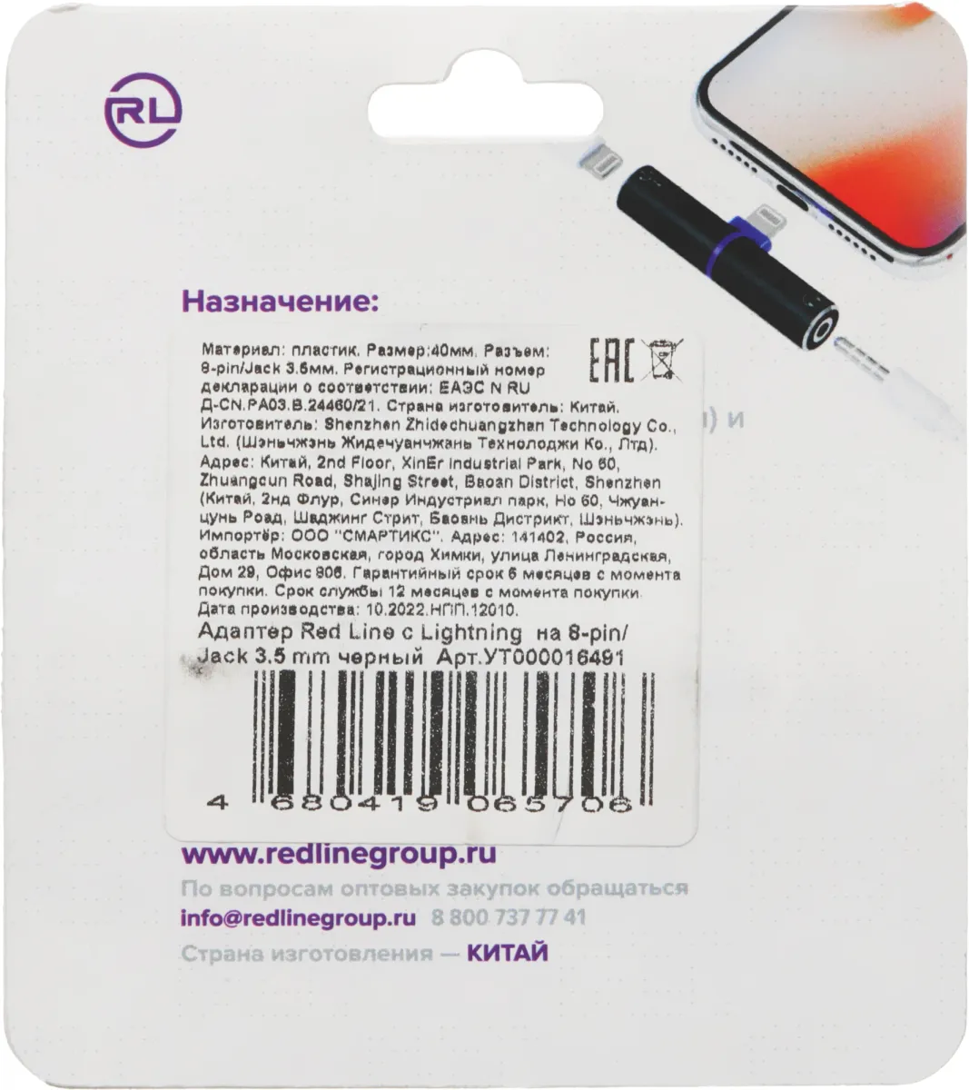 Переходник аудио Red Line lightning/Jack 3.5 (m) черный (УТ000016491) (УТ000016491)