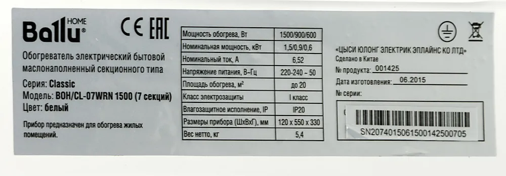| Радиатор масляный Ballu Classic BOH/CL-07WRN 1500Вт белый/черный | ЕАЭС RU С-CN.АЯ46.В.34830/24 | 26.05.2024 | 25.05.2029 |