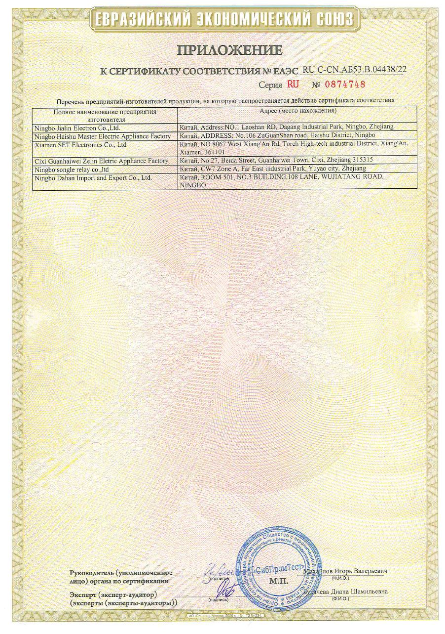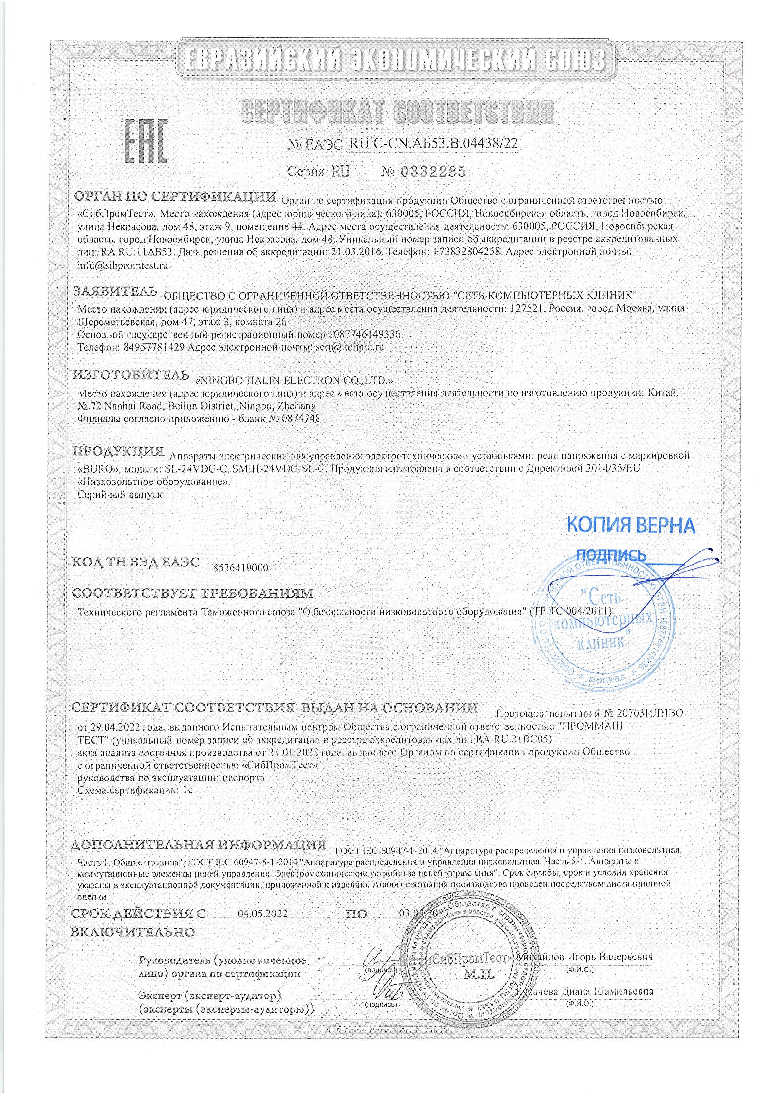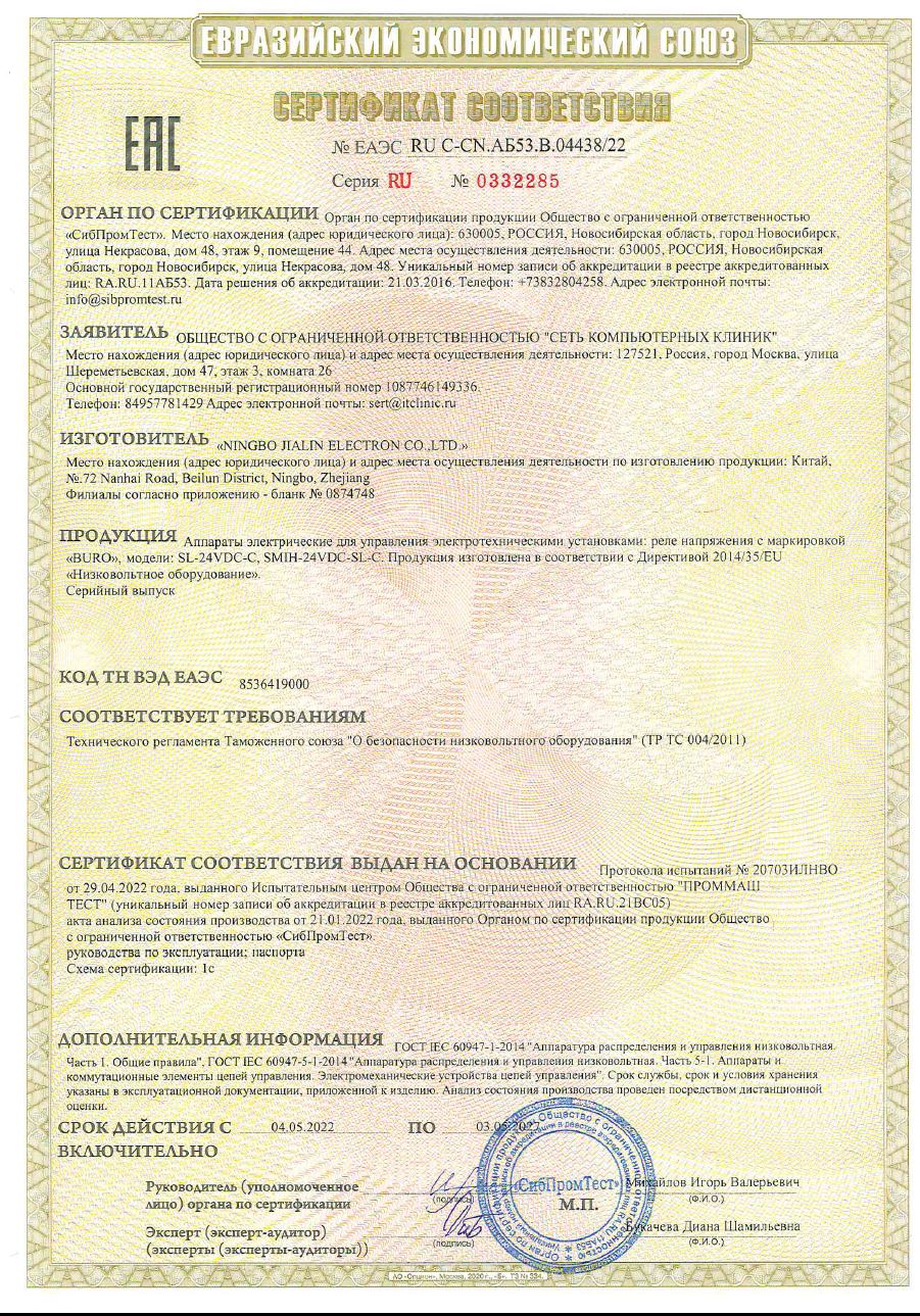 | Реле напряжения Buro SL-24VDC-C | ЕАЭС RU С-CN.АБ53.В.04438/22 | 03.05.2022 | 02.05.2027 |