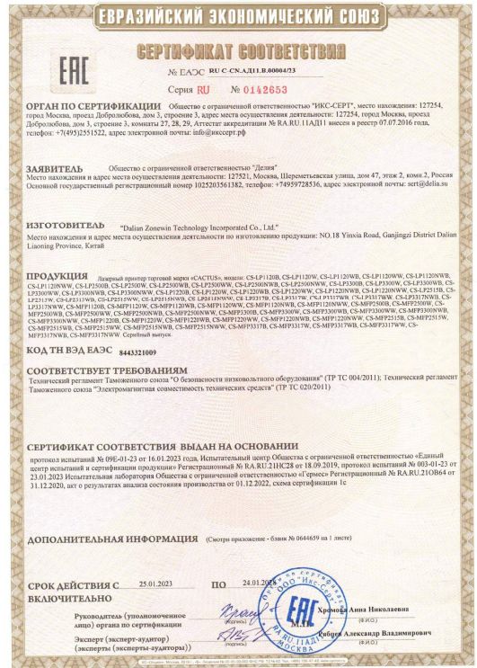 | Принтер лазерный Cactus CS-LP1120NWW A4 белый (в комплекте: картридж + кабель USB, Ethernet) | ЕАЭС RU С-CN.АД11.В.00004/23 | 24.01.2023 | 23.01.2028 |