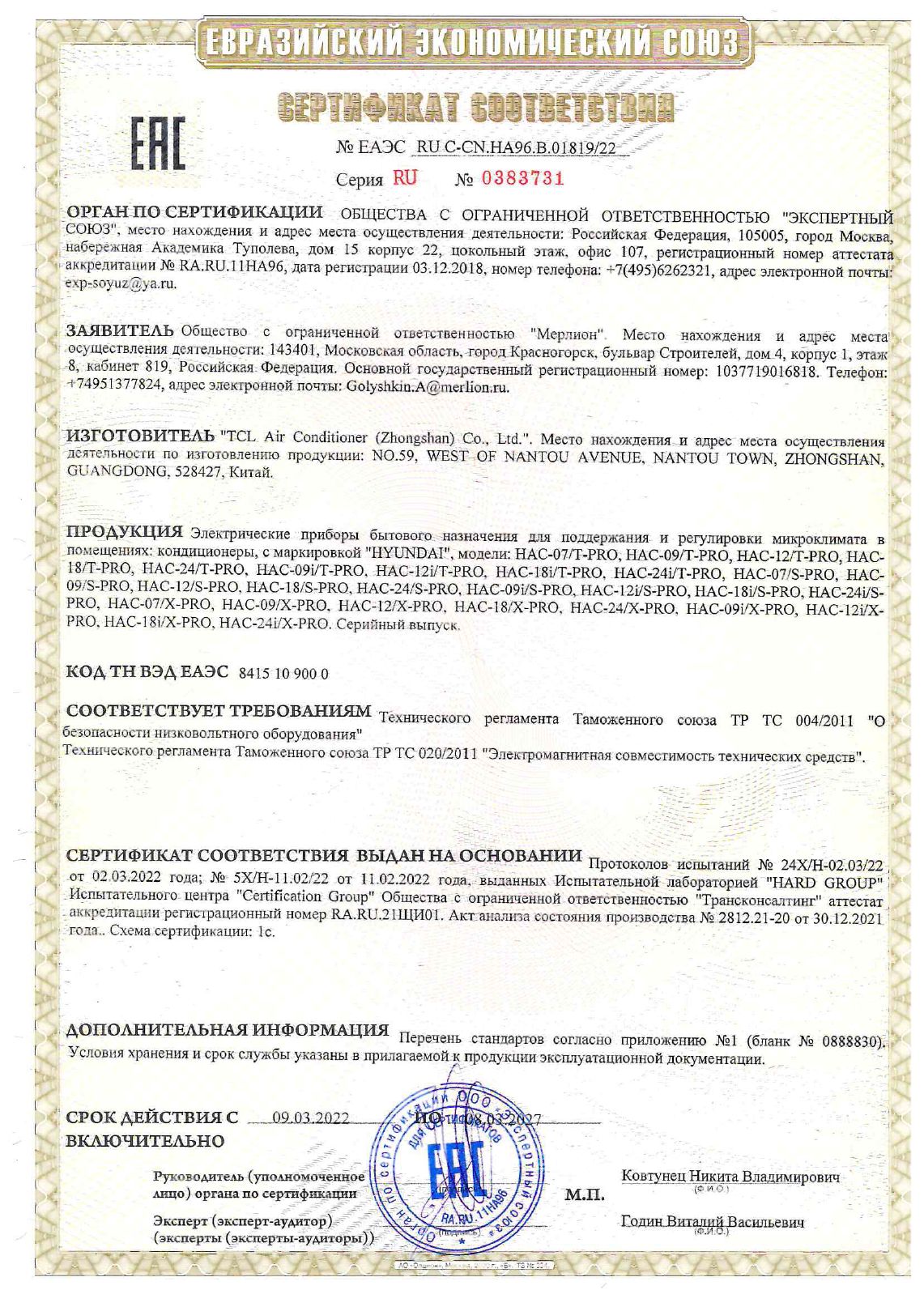 | Сплит-система Hyundai HAC-24/T-PRO белый | ЕАЭС RU С-CN.НА96.В.01819/22 | 08.03.2022 | 07.03.2027 |