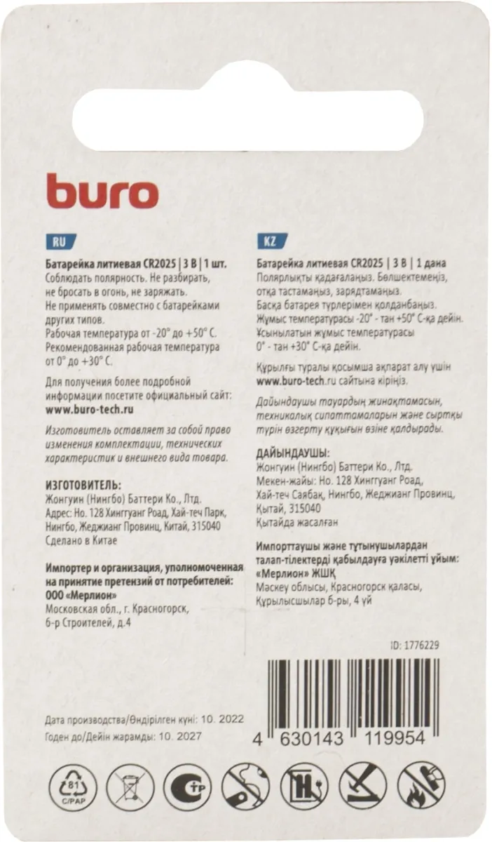 Батарея Buro Lithium CR2025 (1шт) блистер (ML1776229)
