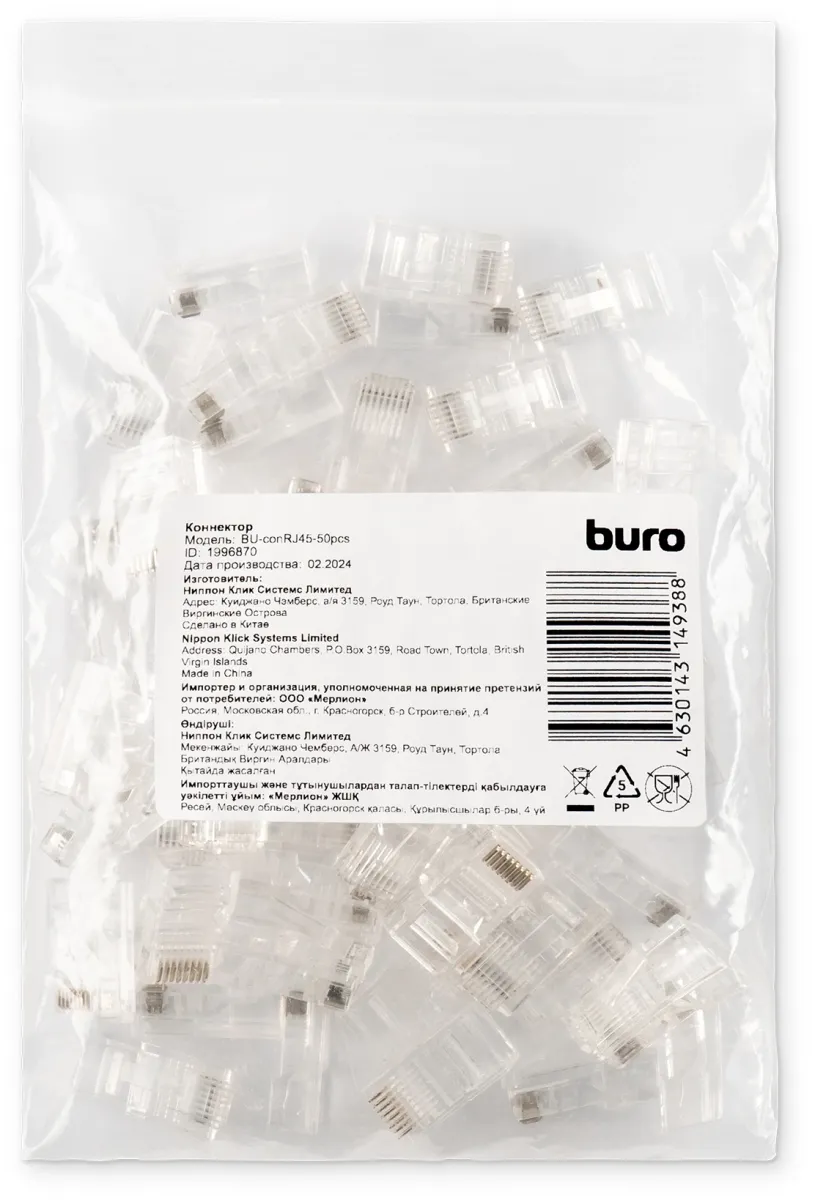Коннектор Buro (BU-CONRJ45-50PCS) RJ45 прозрачный (упак.:50шт) (BU-CONRJ45-50PCS)