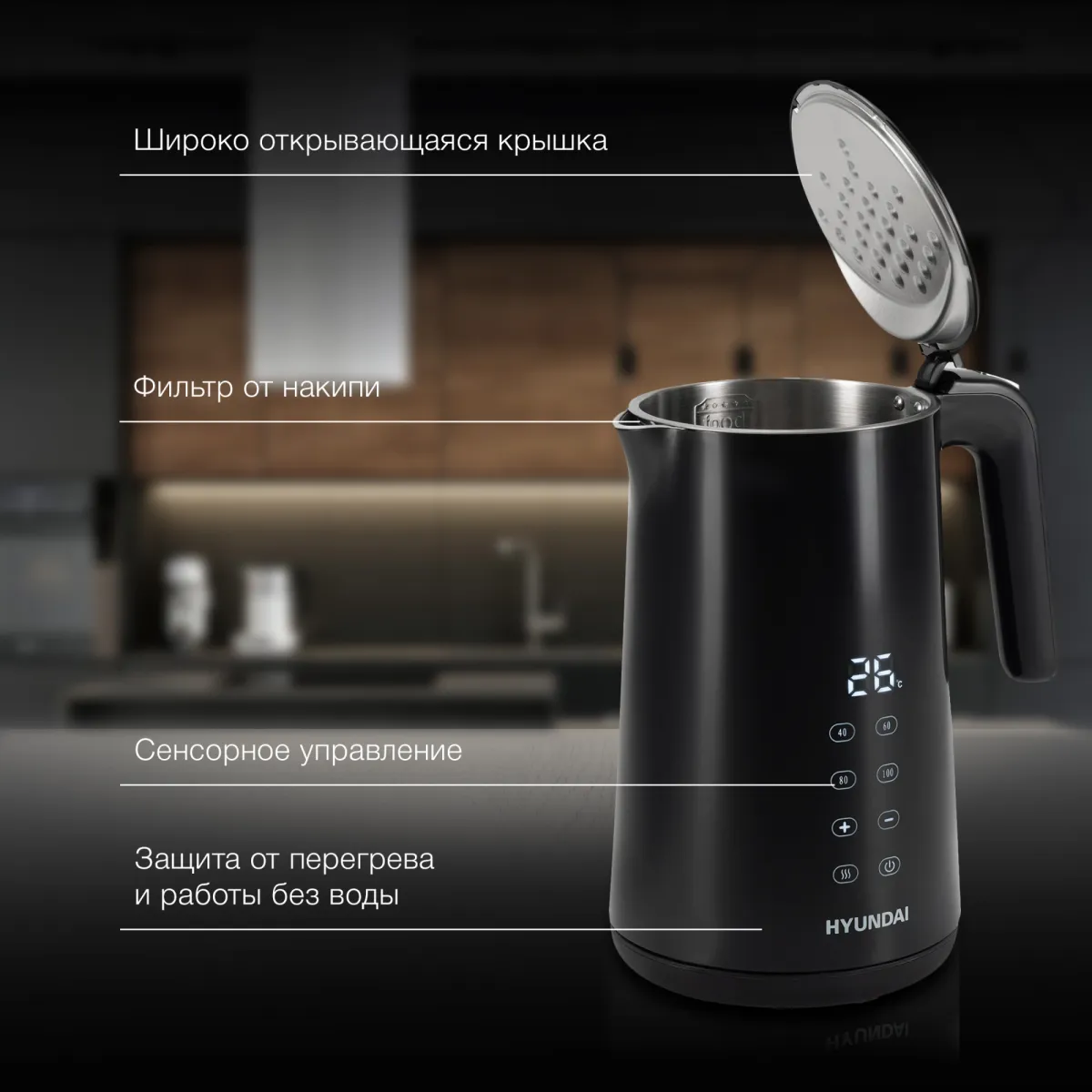 дисплей, кнопка открытия крышки, подставка 360, фильтр от накипи -