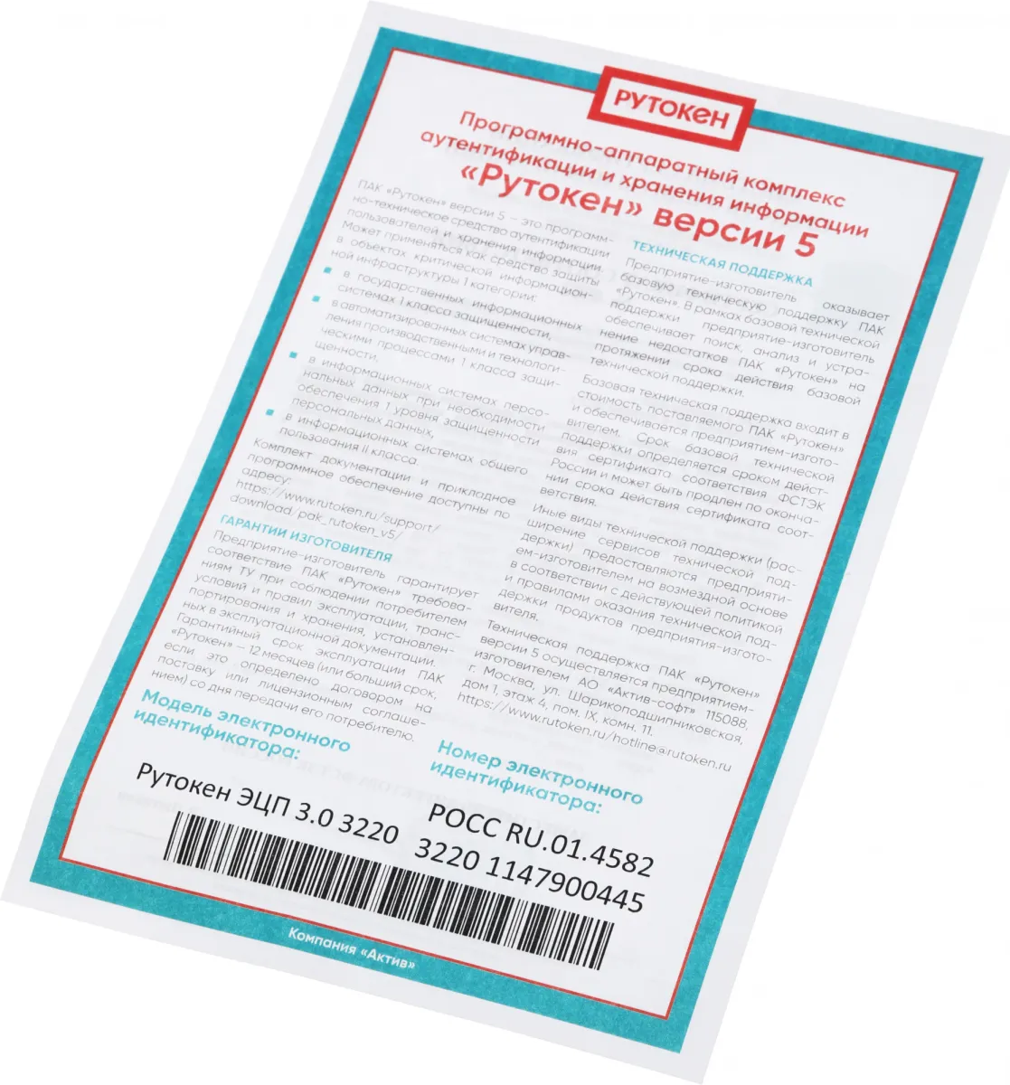 Компонент ПАК Rutoken ЭЦП 3.0 3220 серт.ФСТЭК инд.уп. (ML2010767)